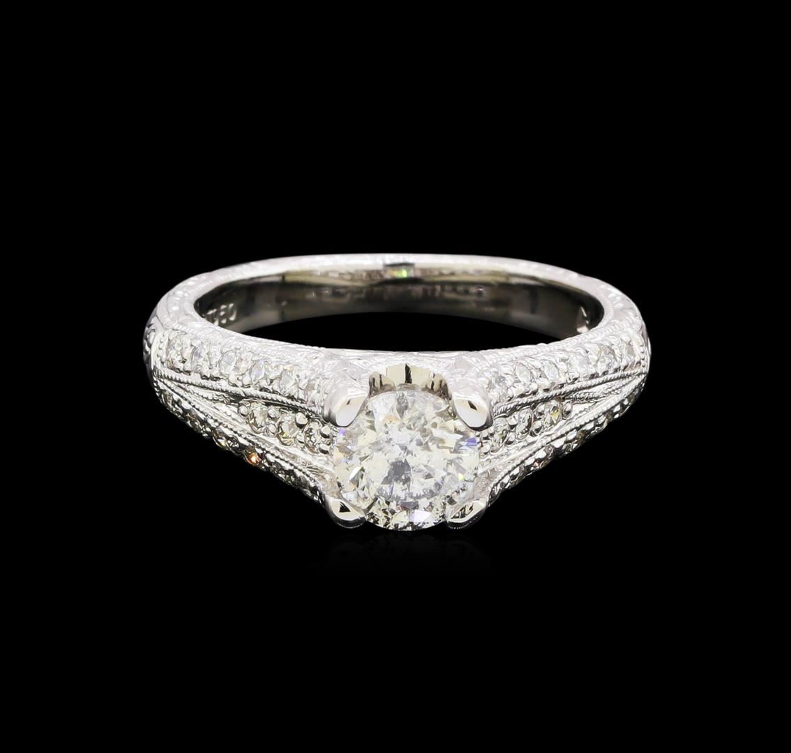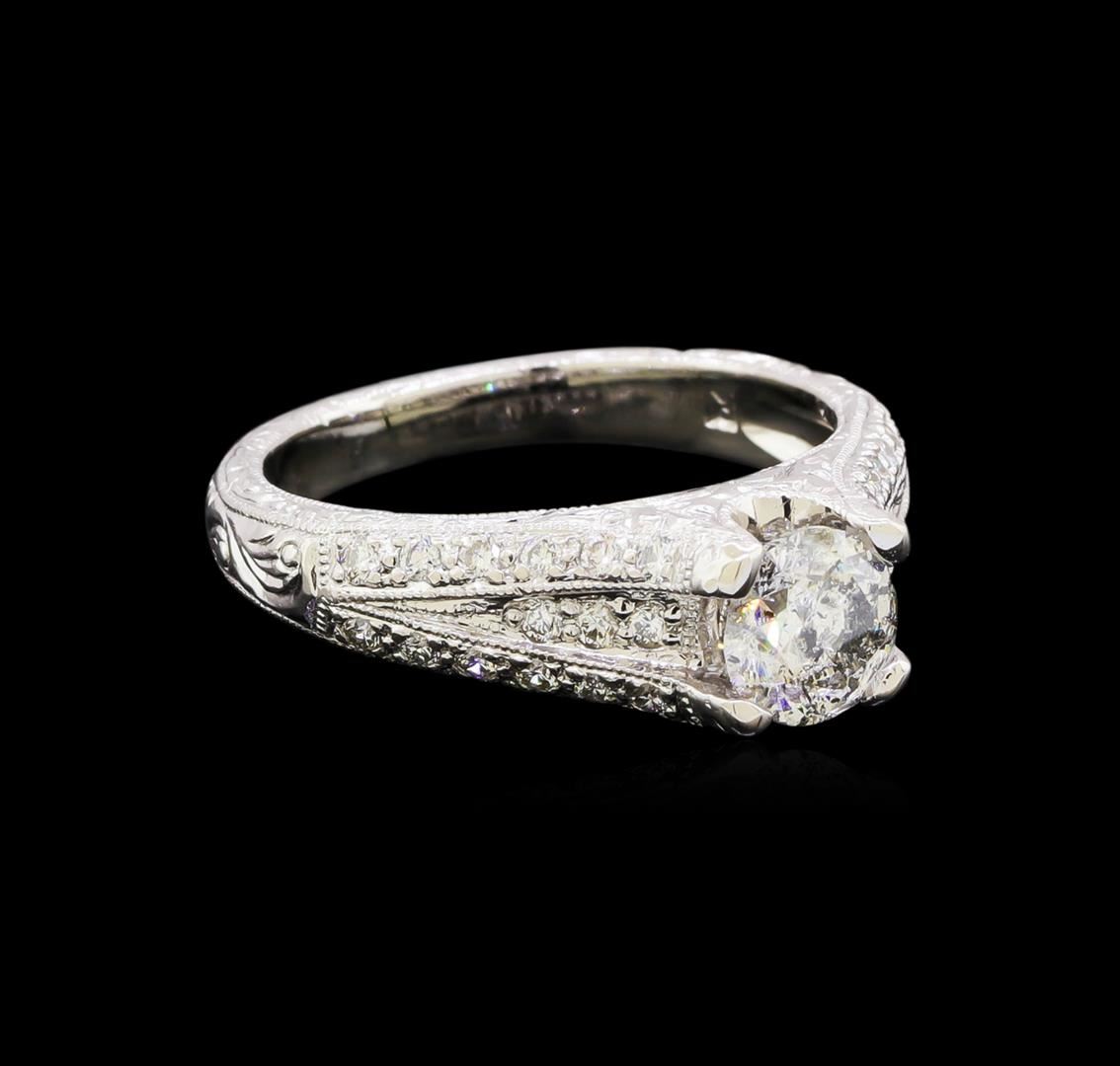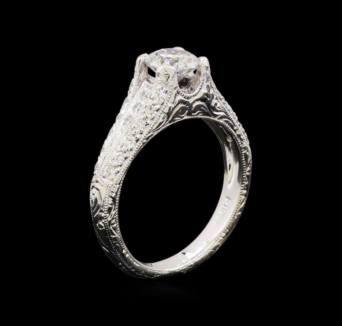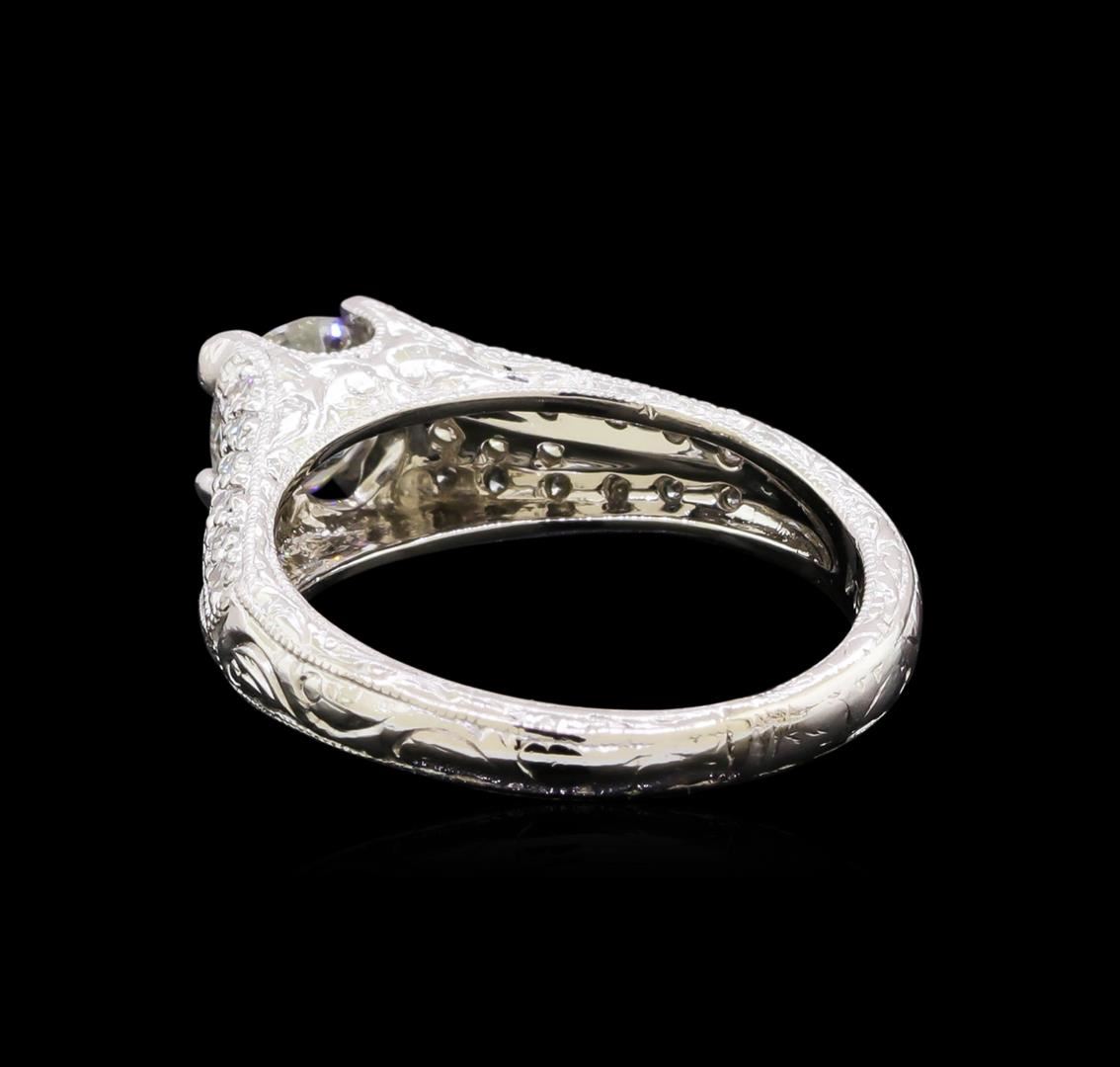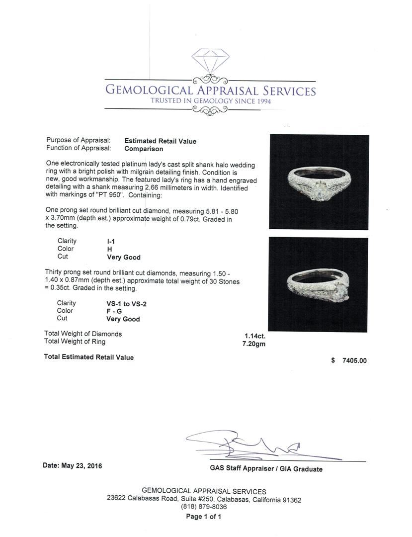 One electronically tested platinum lady's cast split shank halo wedding ring with a bright polish with milgrain detailing finish. The featured lady's ring has a hand engraved detailing with a shank measuring 2,66 millimeters in width. Identified with markings of "PT 950". Condition is new, good workmanship. Containing: One prong set round brilliant cut diamond, measuring 5.81 - 5.80 x 3.70mm (depth est.) approximate weight of 0.79ct. Graded in the setting. Clarity: I-1. Color: Very Good Thirty prong set round brilliant cut diamonds, measuring 1.50 - 1.40 x 0.87mm (depth est.) approximate total weight of 30 Stones = 0.35ct. Graded in the setting. Clarity: VS-1 to VS-2. Color: F - G. Cut Very Good. Total Weight of Diamonds 1.14ct. Total Weight of Ring 7.20gm. GAS Appraised at $7,405.00.