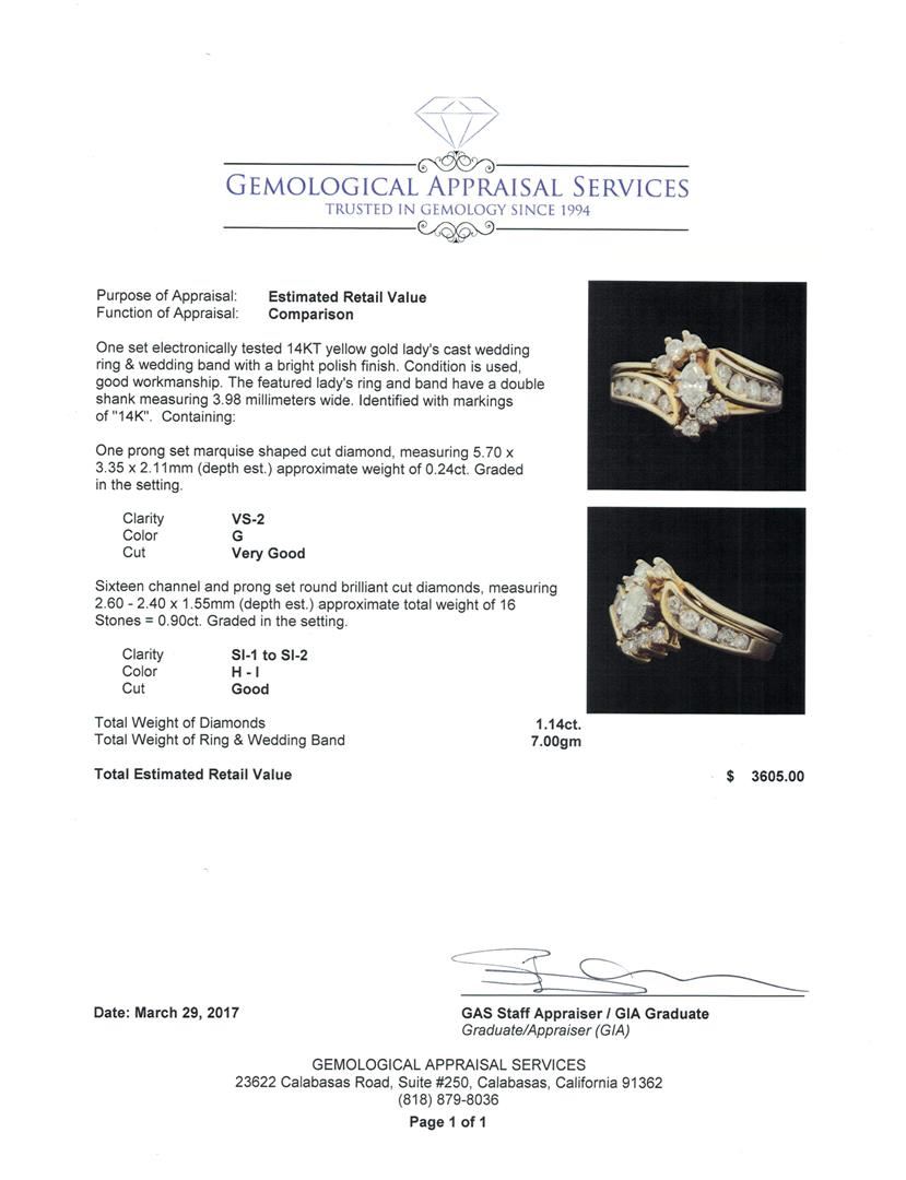 One set electronically tested 14KT yellow gold lady's cast wedding ring & wedding band with a bright polish finish. The featured lady's ring and band have a double shank measuring 3.98 millimeters wide. Identified with markings of '14K'. Condition is used GAS Appraised at $3,605.00.
