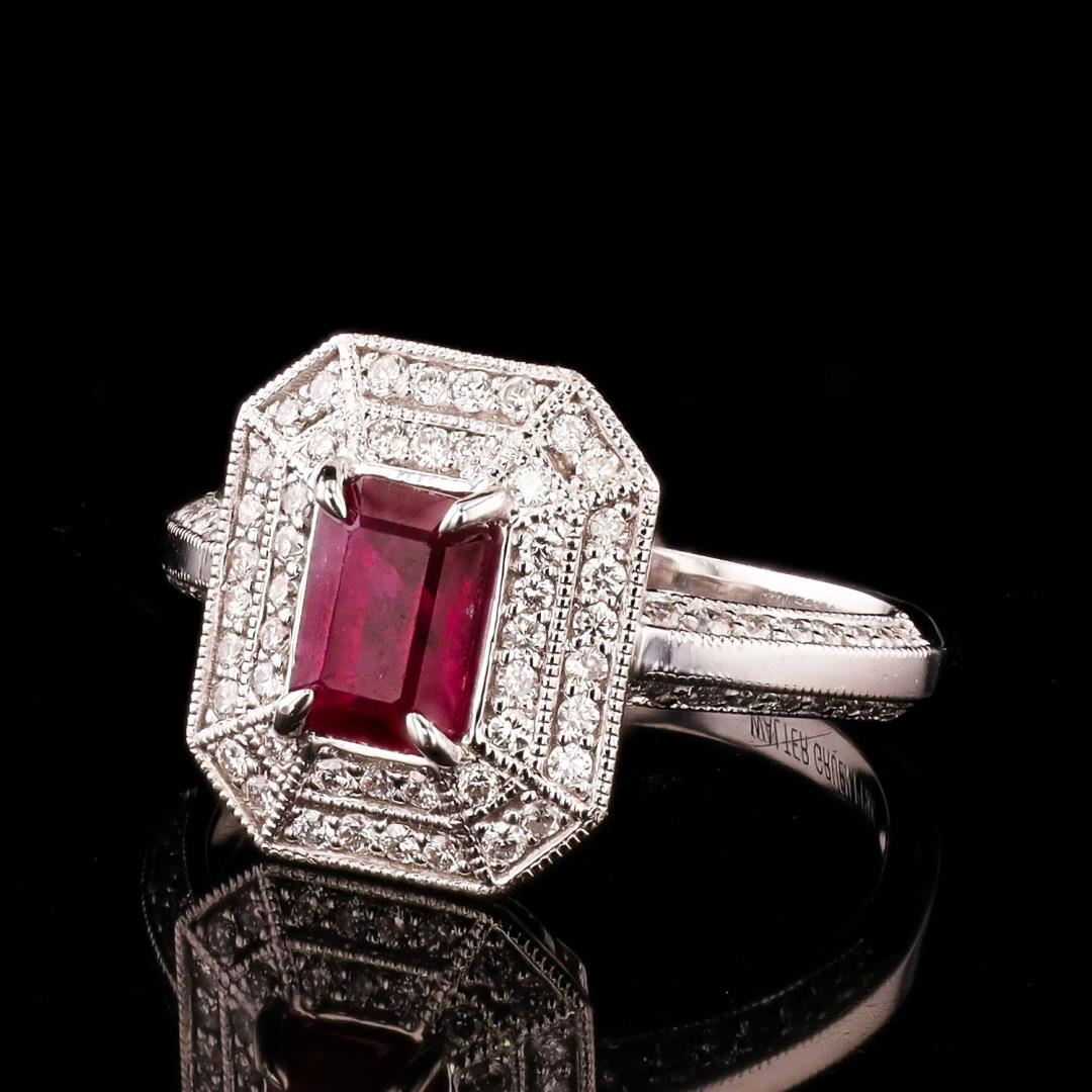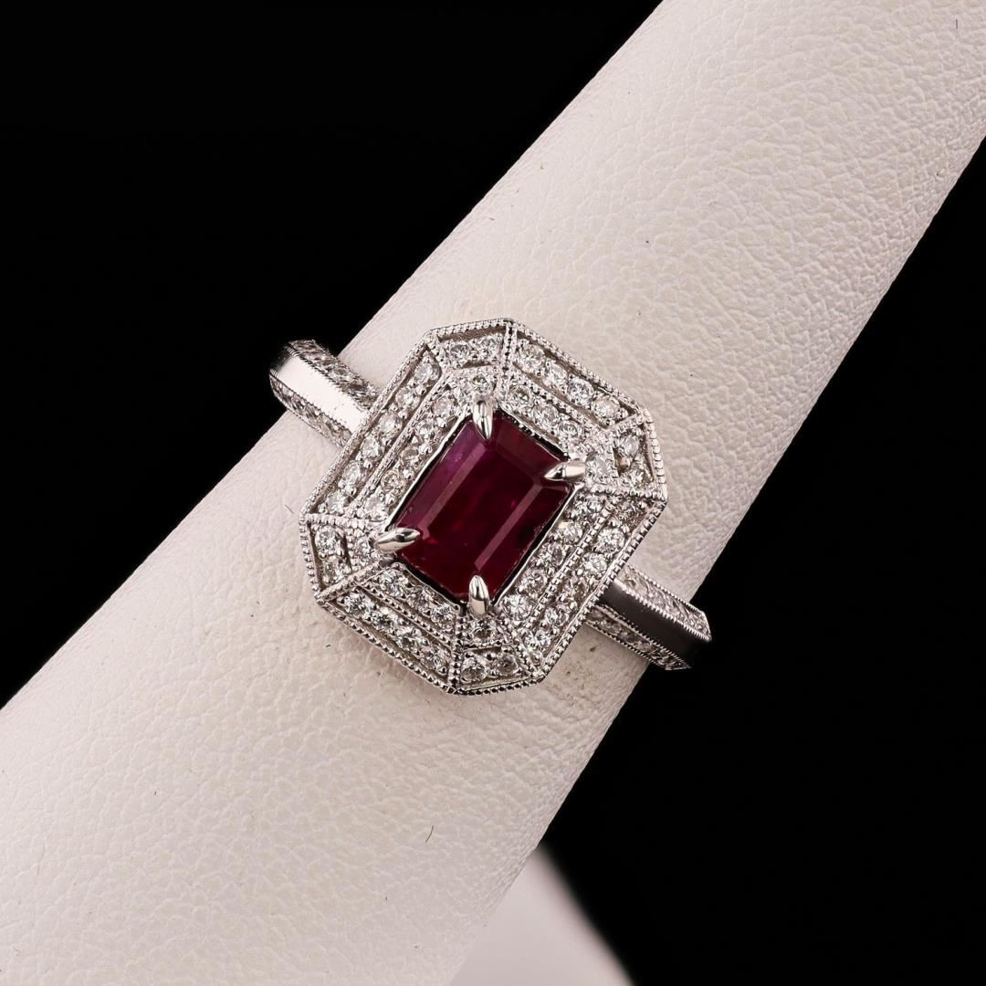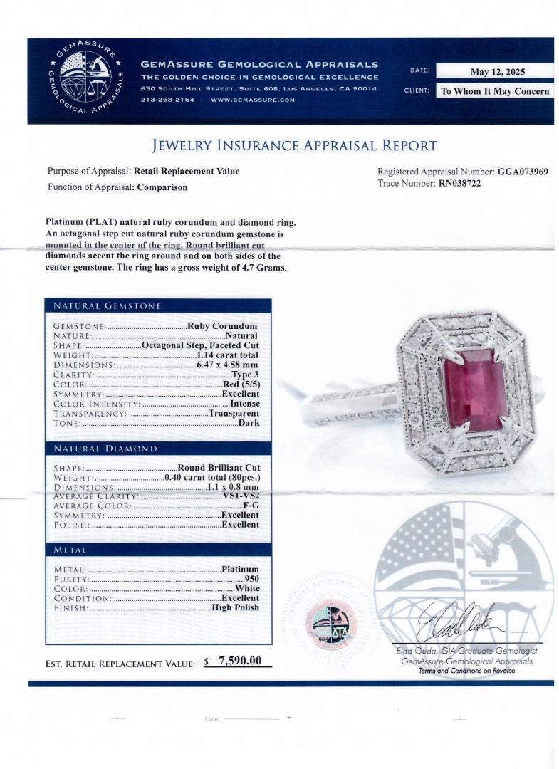 Platinum (PLAT) natural ruby corundum and diamond ring. An octagonal step cut natural ruby corundum gemstone is mounted in the center of the ring. Round brilliant cut diamonds accent the ring around and on both sides of the center gemstone. The ring has a gross weight of 4.7 Grams. #NATURAL GEMSTONE# GEMSTONE: Ruby Corundum NATURE: Natural SHAPE: Octagonal Step, Faceted Cut WEIGHT: 1.14 carat total DIMENSIONS: 6.47 x 4.58mm CLARITY: Type 3 COLOR: Red (5/5) SYMMETRY: Excellent COLOR INTENSITY: Intense TRANSPARENCY: Transparent TONE: Dark #NATURAL DIAMOND# SHAPE: Round Brilliant Cut WEIGHT: 0.40 carat total (80pcs.) DIMENSIONS: 1.1 x 0.8mm AVERAGE CLARITY: VS1-VS2 AVERAGE COLOR: F-G SYMMETRY: Excellent POLISH: Excellent #METAL# METAL: Platinum PURITY: 950 COLOR: White CONDITION: Excellent FINISH: High Polish Size: 7