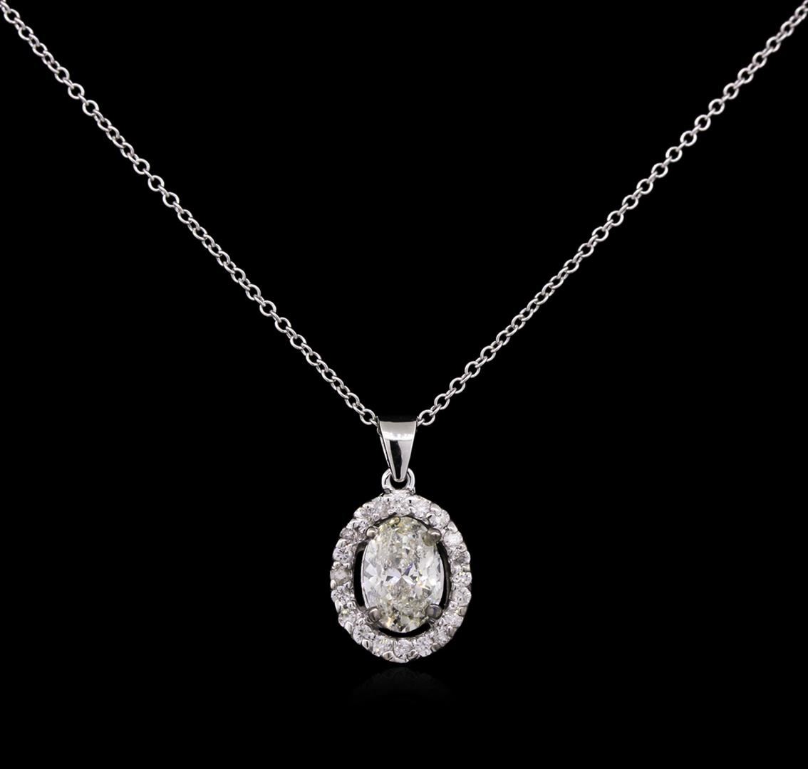 One electronically tested 14KT white gold lady's combination cast & assembled fashion pendant & chain 18.0" long, 1mm round cable link with a spring ring clasp with a halo with a bright polish finish. Identified with markings of "14K". Condition is new, good workmanship. Containing: One prong set oval shaped cut diamond, measuring 7.60 x 5.12 x 3.34mm (depth est.) , 15.00.%. GTCF approximate weight of 0.97ct. Graded in the setting. Clarity: I-1. Color: Good Twenty prong set round brilliant cut diamonds, measuring 1.30 - 1.25 x 0.83mm (depth est.) approximate total weight of 20 Stones = 0.17ct. Graded in the setting. Clarity: SI-1 to I-1. Color: G - I. Cut Good. Total Weight of Diamonds 1.14ct. Total Weight of Pendant & Chain 3.00gm. GAS Appraised at $6,365.00.