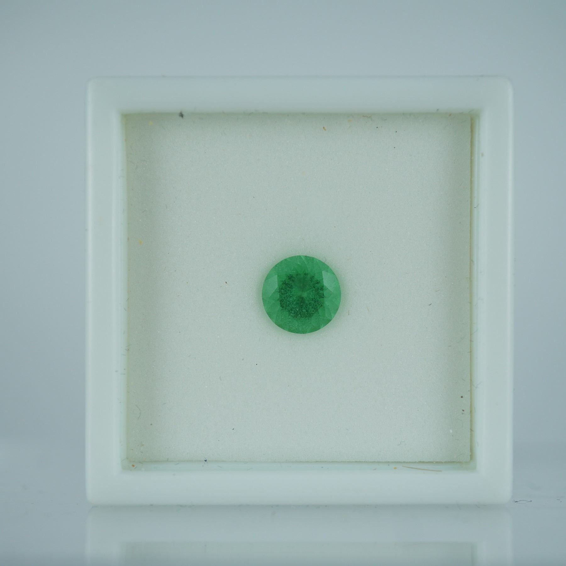 Faceted round cut Zandrite gemstone, weighing approximately 1.15 carats. Zandrite is a lab-created color-change gemstone that shifts in appearance depending on the surrounding light ranging from soft gray tones to vibrant shades under certain conditions. A distinctive and dynamic option for collectors or custom jewelry projects. Comes with a protective case.
