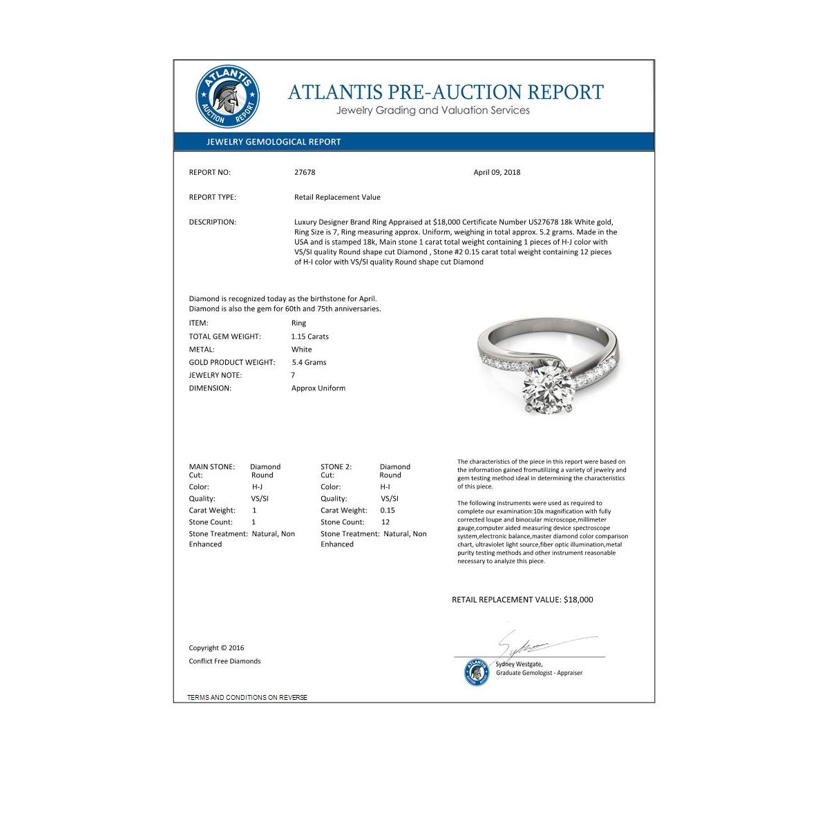 REF-363H5A -27678 ---- 1.15 CTW Certified VS/SI Diamond Bypass Solitaire Ring 18K White Gold ---- Luxury Designer Brand Ring Appraised at $18,000 Certificate Number US27678 18k White gold, Ring Size is 7, Ring measuring approx. Uniform, weighing in total approx. 5.2 grams. Made in the USA and is stamped 18k, Main stone 1 carat total weight containing 1 pieces of H-J color with VS/SI quality Round shape cut Diamond , Stone #2 0.15 carat total weight containing 12 pieces of H-I color with VS/SI quality Round shape cut Diamond