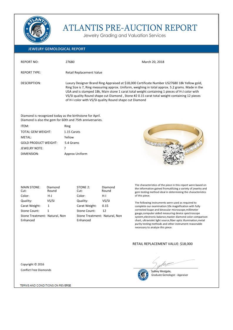 REF-363T5M -27680 ---- 1.15 CTW Certified VS/SI Diamond Bypass Solitaire Ring 18K Yellow Gold ---- Luxury Designer Brand Ring Appraised at $18,000 Certificate Number US27680 18k Yellow gold, Ring Size is 7, Ring measuring approx. Uniform, weighing in total approx. 5.2 grams. Made in the USA and is stamped 18k, Main stone 1 carat total weight containing 1 pieces of H-J color with VS/SI quality Round shape cut Diamond , Stone #2 0.15 carat total weight containing 12 pieces of H-I color with VS/SI quality Round shape cut Diamond