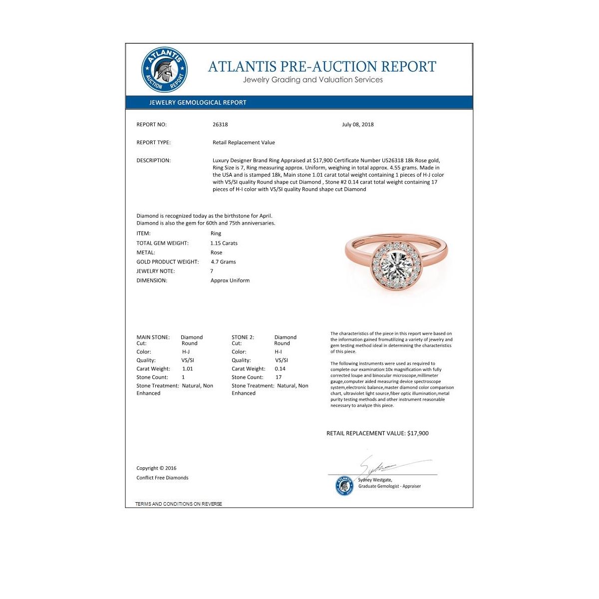 REF-298H6A -26318 ---- 1.15 CTW Certified VS/SI Diamond Solitaire Halo Ring 18K Rose Gold ---- Luxury Designer Brand Ring Appraised at $17,900 Certificate Number US26318 18k Rose gold, Ring Size is 7, Ring measuring approx. Uniform, weighing in total approx. 4.55 grams. Made in the USA and is stamped 18k, Main stone 1.01 carat total weight containing 1 pieces of H-J color with VS/SI quality Round shape cut Diamond , Stone #2 0.14 carat total weight containing 17 pieces of H-I color with VS/SI quality Round shape cut Diamond
