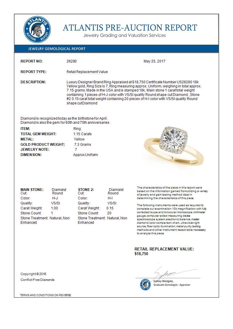 1.15 CTW Certified VS/SI Diamond Solitaire Halo Ring 18K Yellow Gold ---- Luxury Designer Brand Ring Appraised Retail Price at $18,750 ---- SKU Number US26280 18k Yellow gold Ring Size is 7, Ring measuring approx. Uniform, weighing in total approx. 7.15 grams. Made in the USA and is stamped 18k, Main stone 1.00 carat total weight containing 1 pieces of H-J color with VS/SI quality Round shape cut Diamond , Stone #2 0.15 carat total weight containing 20 pieces of H-I color with VS/SI quality Round shape cut