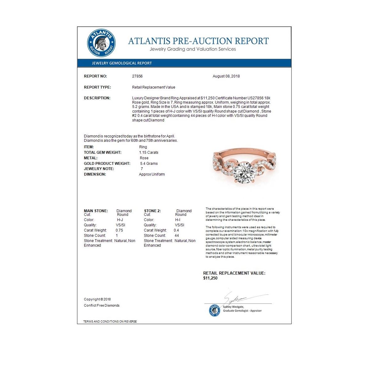 REF-204W9F -27856 ---- 1.15 CTW Certified VS/SI Diamond Solitaire Ring 18K Rose Gold ---- Luxury Designer Brand Ring Appraised at $11,250 Certificate Number US27856  18k Rose gold,  Ring Size is 7, Ring measuring approx. Uniform, weighing in total approx. 5.2 grams. Made in the USA and is stamped 18k, Main stone 0.75 carat total weight containing 1 pieces of H-J color with VS/SI quality Round shape cut Diamond , Stone #2 0.4 carat total weight containing 44 pieces of H-I color with  VS/SI quality Round shape cut Diamond