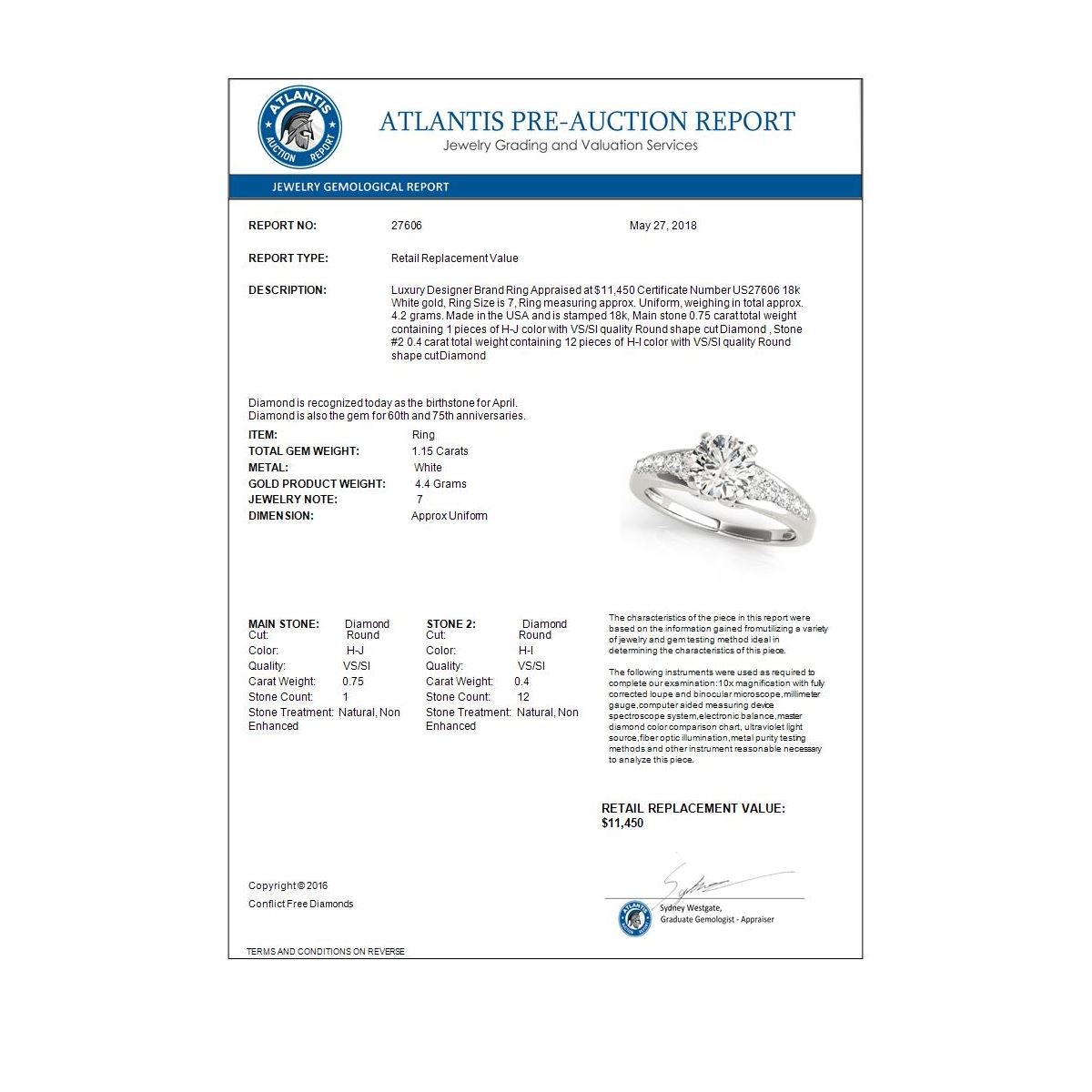 REF-208M2H -27606 ---- 1.15 CTW Certified VS/SI Diamond Solitaire Ring 18K White Gold ---- Luxury Designer Brand Ring Appraised at $11,450 Certificate Number US27606 18k White gold, Ring Size is 7, Ring measuring approx. Uniform, weighing in total approx. 4.2 grams. Made in the USA and is stamped 18k, Main stone 0.75 carat total weight containing 1 pieces of H-J color with VS/SI quality Round shape cut Diamond , Stone #2 0.4 carat total weight containing 12 pieces of H-I color with VS/SI quality Round shape cut Diamond