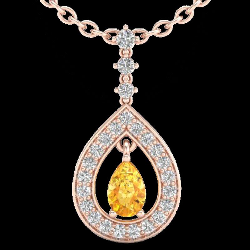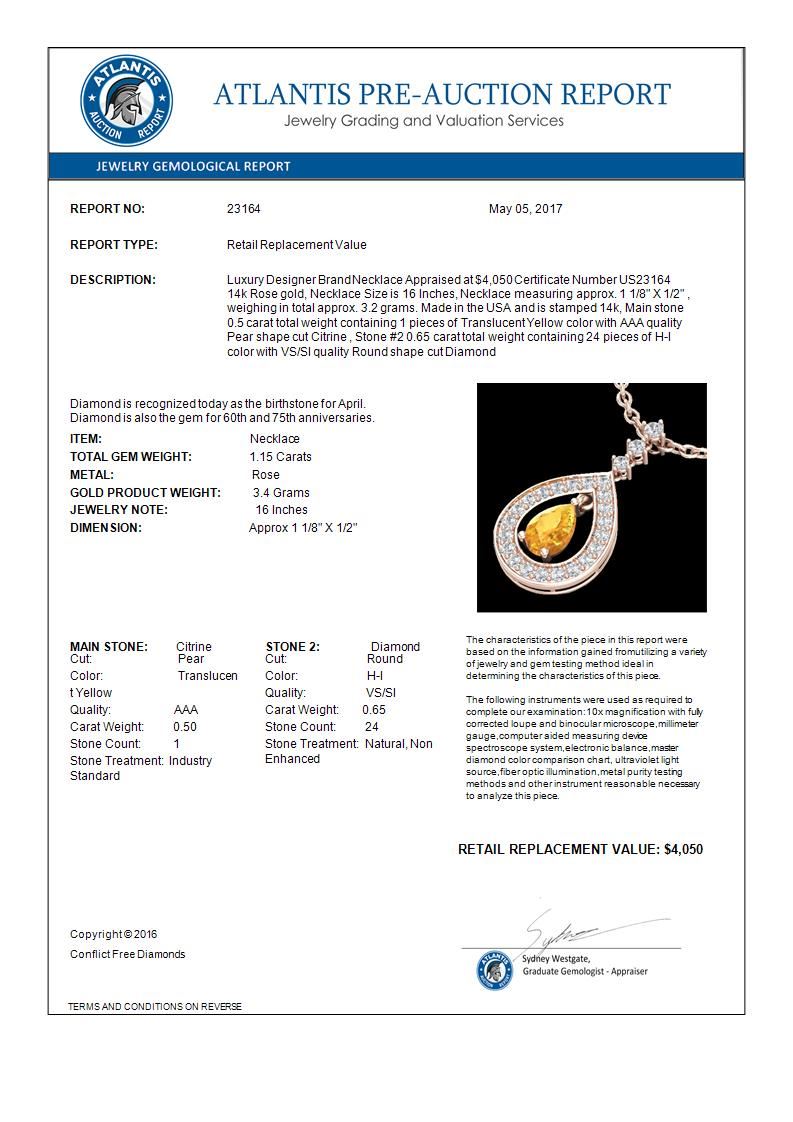 1.15 CTW Citrine & Micro Pave VS/SI Diamond Necklace Designer 14K Rose Gold ---- Luxury Designer Brand Necklace Appraised Retail Price at $4,050 ---- SKU Number US23164 14k Rose gold Necklace Size is 16 Inches, Necklace measuring approx. 1 1/8" X 1/2" , weighing in total approx. 3.2 grams. Made in the USA and is stamped 14k, Main stone 0.50 carat total weight containing 1 pieces of Translucent Yellow color with AAA quality Pear shape cut Citrine , Stone #2 0.65 carat total weight containing 24 pieces of H-I color with VS/SI quality Round shape cut