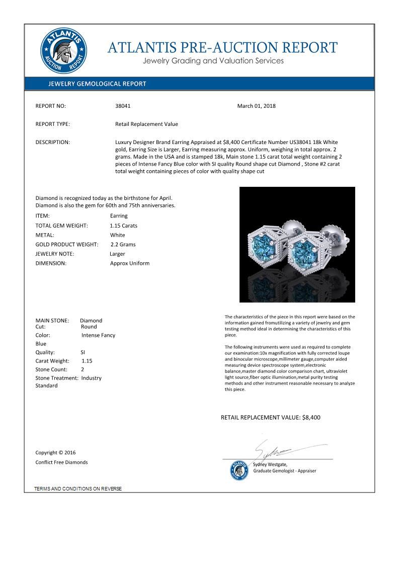 REF-127H3A -38041 ---- 1.15 CTW Fancy Intense Blue Diamond Art Deco Stud Earrings 18K White Gold ---- Luxury Designer Brand Earring Appraised at $8,400 Certificate Number US38041 18k White gold, Earring Size is Larger, Earring measuring approx. Uniform, weighing in total approx. 2 grams. Made in the USA and is stamped 18k, Main stone 1.15 carat total weight containing 2 pieces of Intense Fancy Blue color with SI quality Round shape cut Diamond , Stone #2 carat total weight containing pieces of color with quality shape cut