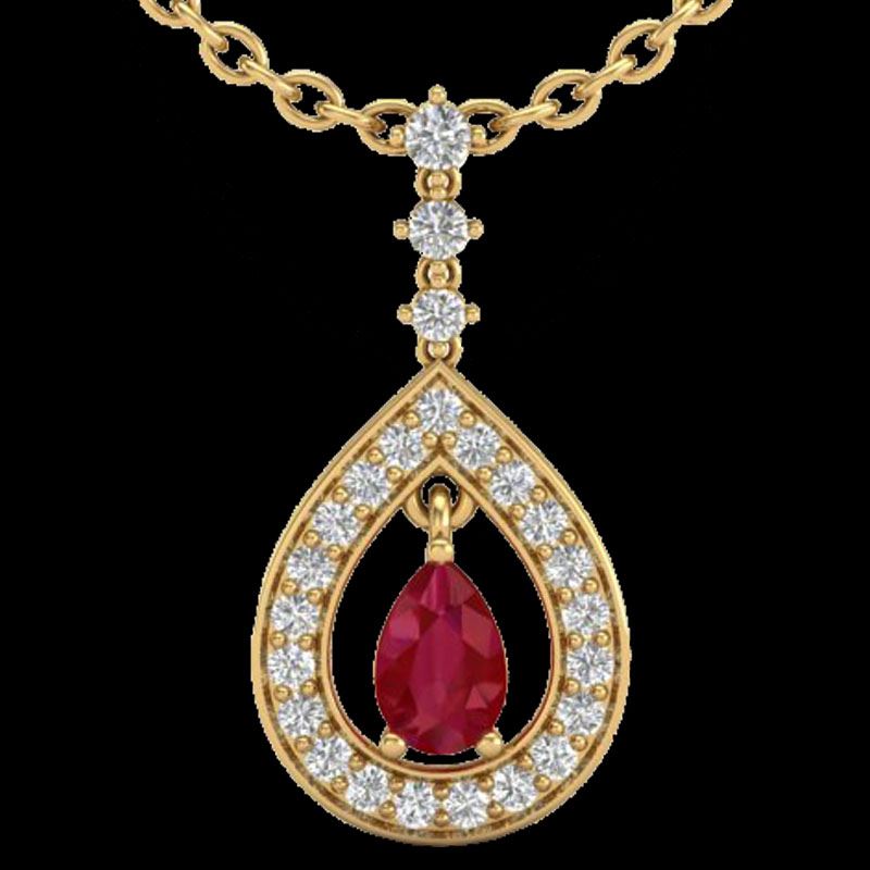 REF-60M9H -23169 ---- 1.15 CTW Ruby & Micro Pave VS/SI Diamond Necklace Designer 14K Yellow Gold ---- Luxury Designer Brand Necklace Appraised at $4,350 Certificate Number US23169 14k Yellow gold, Necklace Size is 16 Inches, Necklace measuring approx. 1 1/8" X 1/2" , weighing in total approx. 3.2 grams. Made in the USA and is stamped 14k, Main stone 0.5 carat total weight containing 1 pieces of Mid-Opaque-Deep Red color with AAA quality Pear shape cut Ruby , Stone #2 0.65 carat total weight containing 24 pieces of H-I color with VS/SI quality Round shape cut Diamond
