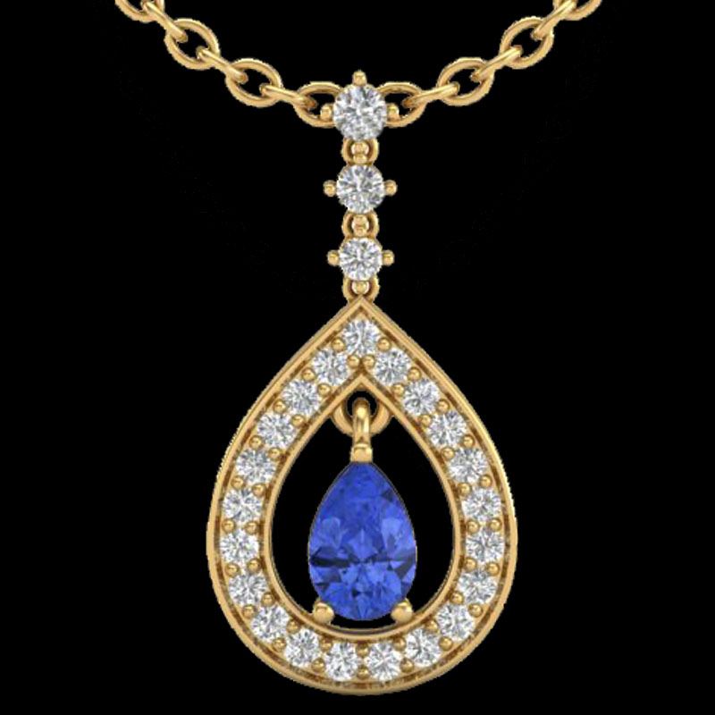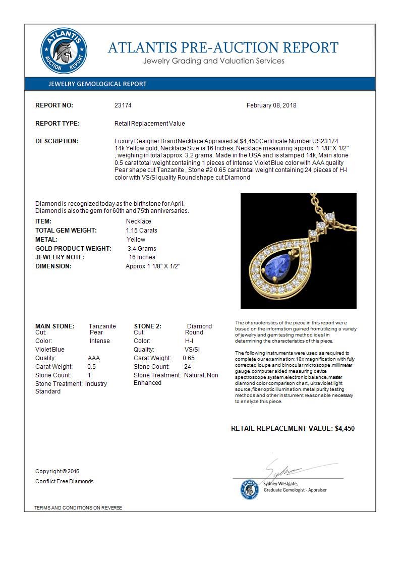 REF-62M2H -23174 ---- 1.15 CTW Tanzanite & Micro Pave VS/SI Diamond Necklace Designer 14K Yellow Gold ---- Luxury Designer Brand Necklace Appraised at $4,450 Certificate Number US23174 14k Yellow gold, Necklace Size is 16 Inches, Necklace measuring approx. 1 1/8" X 1/2" , weighing in total approx. 3.2 grams. Made in the USA and is stamped 14k, Main stone 0.5 carat total weight containing 1 pieces of Intense Violet Blue color with AAA quality Pear shape cut Tanzanite , Stone #2 0.65 carat total weight containing 24 pieces of H-I color with VS/SI quality Round shape cut Diamond