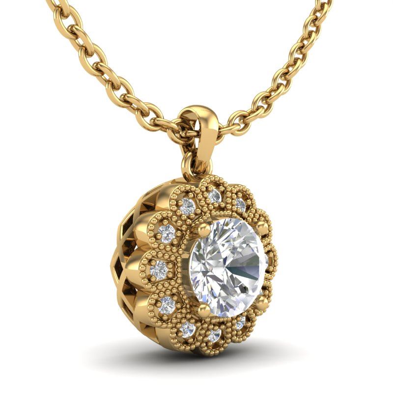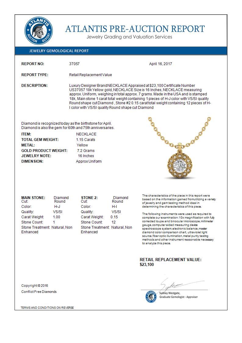 1.15 CTW VS/SI Diamond Solitaire Art Deco Necklace 18K Yellow Gold ---- Luxury Designer Brand NECKLACE Appraised Retail Price at $23,100 ---- SKU Number US37057 18k Yellow gold NECKLACE Size is 16 Inches, NECKLACE measuring approx. Uniform, weighing in total approx. 7 grams. Made in the USA and is stamped 18k, Main stone 1.00 carat total weight containing 1 pieces of H-J color with VS/SI quality Round shape cut Diamond , Stone #2 0.15 carat total weight containing 12 pieces of H-I color with VS/SI quality Round shape cut
