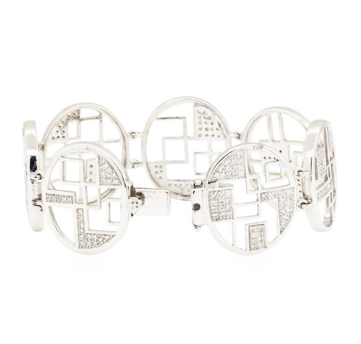 One electronically tested 14KT white gold lady's combination cast & assembled fashion bracelet with a tongue clasp with foldover safety with a bright polish finish. The featured lady's bracelet has seven oval links with 'De Stijl' motifs and measures six and three quarter inches in length. Identified with markings of '14K'. Condition is new, good workmanship. Containing: One Hundred Eighty-Eight bead set round brilliant cut diamonds, measuring 1.20 - 1.15 x 0.73mm (depth est.) approximate total weight of 188 Stones = 1.15ct. Graded in the setting. Color H - I Clarity SI-1 to I-1 Cut Good. Total Weight of Diamonds 1.15ct.. Total Weight of Bracelet 35.40gm GAS Appraised at $7190.00. GAS Appraised.