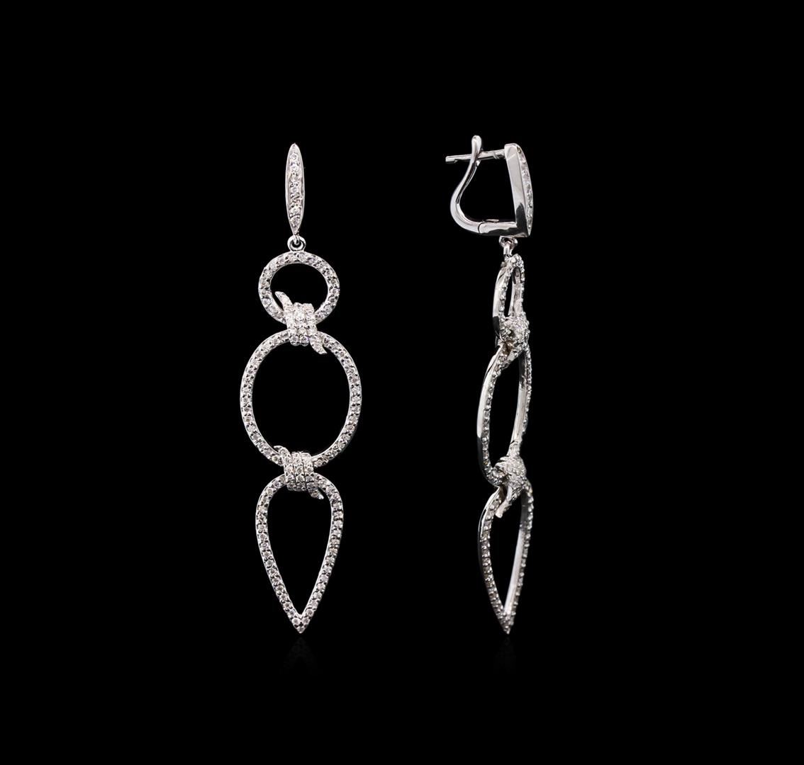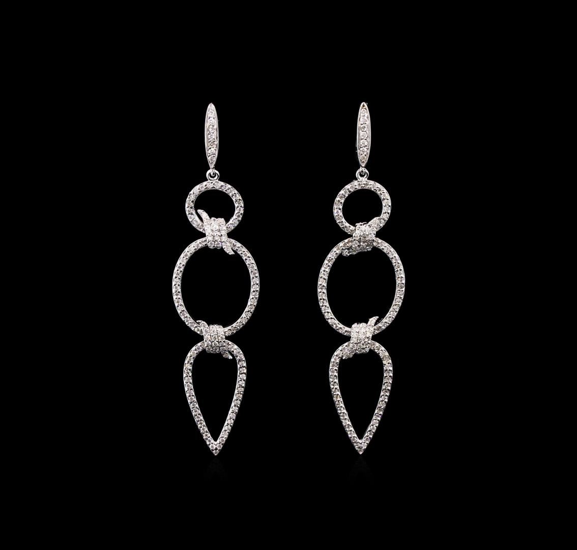 One pair electronically tested 14KT white gold ladies cast & assembled diamond dangle earrings with hinged, snap locking posts. Bright polish finish. Identified with markings of "K14". Condition is new, good workmanship. Containing: Two Hundred Fifty prong set round brilliant cut diamonds, measuring 1.10 - 1.00 x 0.63mm exact total weight 250 Stones = 1.15ct. Graded in the setting. Clarity: SI-1 to SI-2. Color: G - I. Total Weight of Diamonds 1.15ct. Total Weight of Earrings 8.13gm. AIG Appraised at $6,095.00.