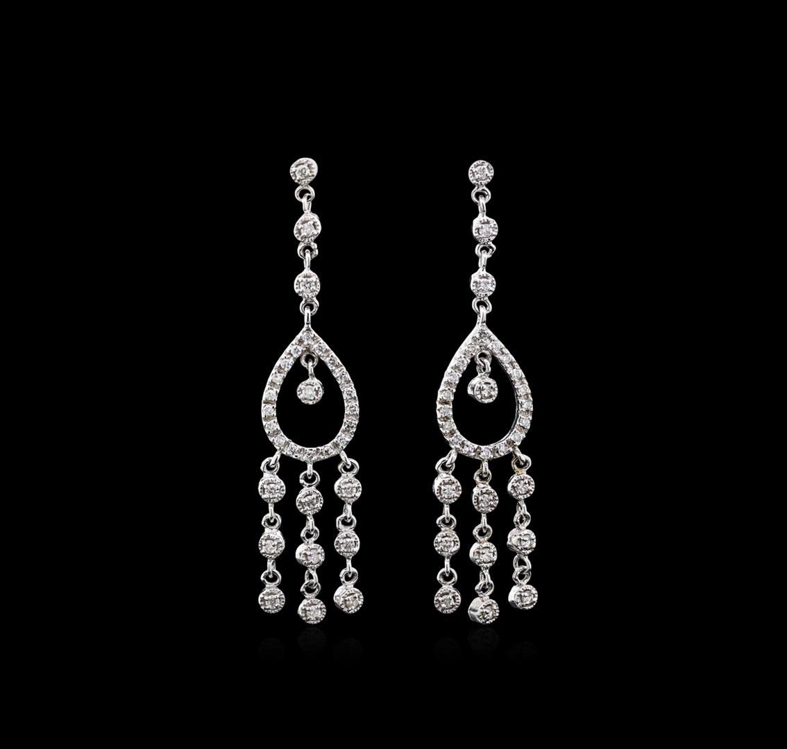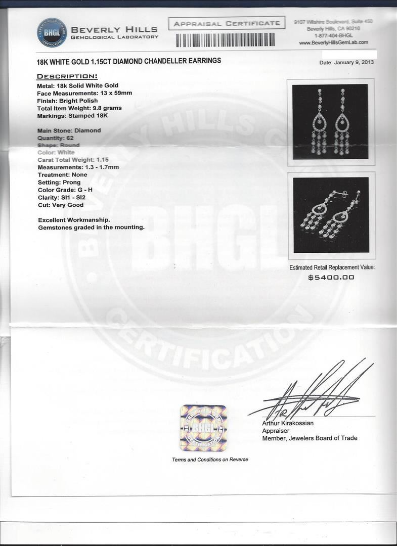 One 18KT white gold 1.15ctw diamond chandeller earrings. Metal: 18KT solid white gold. Face Measurements: 13 x 59mm. Finish: Bright polish. Total Item Weight: 9.8 grams. Markings: Stamped 18KT. Containing: 62 round Diamonds with a total weight of 1.15ct. Measuring: 1.3 - 1.7mm. Treatment: None. Setting: Prong. Color: G - H. Clarity: SI1 -SI2. Cut: Very good. Excellent workmanship. Gemstones graded in the setting. BHGL Appraised at $5,400.00.