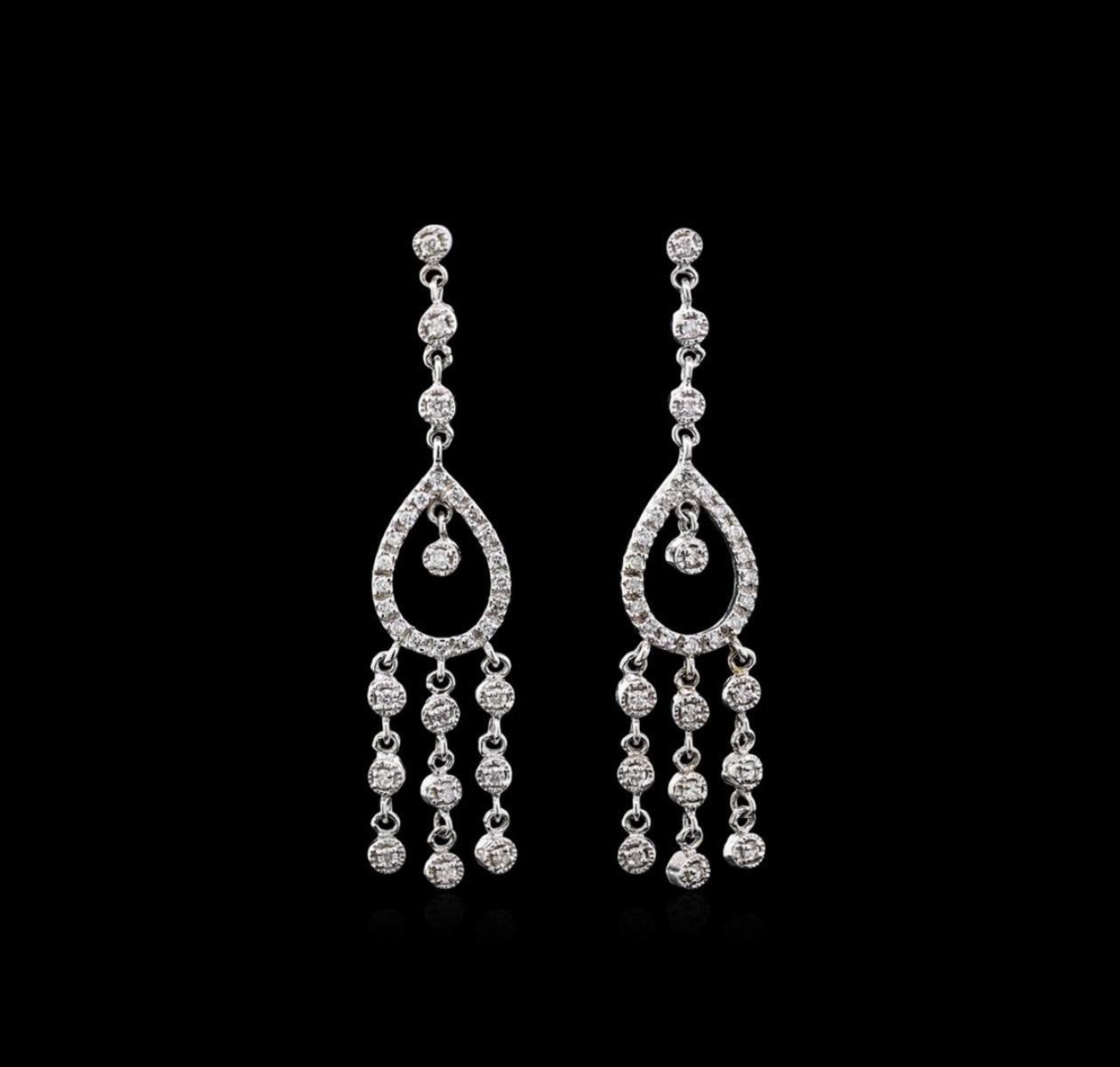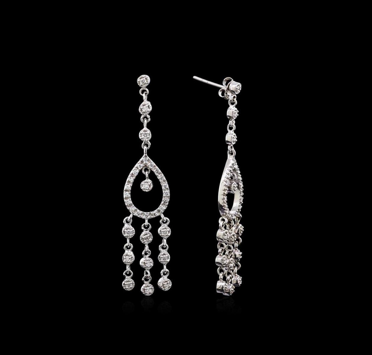 One Pair 18KT white gold 1.15ctw diamond chandeller earrings. Metal: 18KT solid white gold. Face Measurements: 13 x 59mm. Finish: Bright polish. Total Item Weight: 9.8 grams. Markings: Stamped 18KT. Containing: 62 round Diamonds with a total weight of 1.15ct. Measuring: 1.3 - 1.7mm. Treatment: None. Setting: Prong. Color: G - H. Clarity: SI1 -SI2. Cut: Very good. Excellent workmanship. Gemstones graded in the setting. BHGL Appraised.