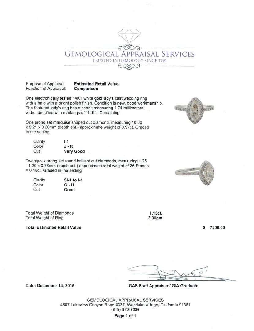 One electronically tested 14KT white gold lady's cast wedding ring with a halo with a bright polish finish. The featured lady's ring has a shank measuring 1.74 millimeters wide. Identified with markings of "14K". Condition is new, good workmanship. Containing: One prong set marquise shaped cut diamond, measuring 10.00 x 5.21 x 3.28mm (depth est.) approximate weight of 0.97ct. Graded in the setting. Clarity: I-1. Color: J - Very Good Twenty-Six prong set round brilliant cut diamonds, measuring 1.25 - 1.20 x 0.76mm (depth est.) approximate total weight of 26 Stones = 0.18ct. Graded in the setting. Clarity: SI-1 to I-1. Color: G - Good. Total Weight of Diamonds 1.15ct. Total Weight of Ring 3.30gm. GAS Appraised at $7,200.00.
