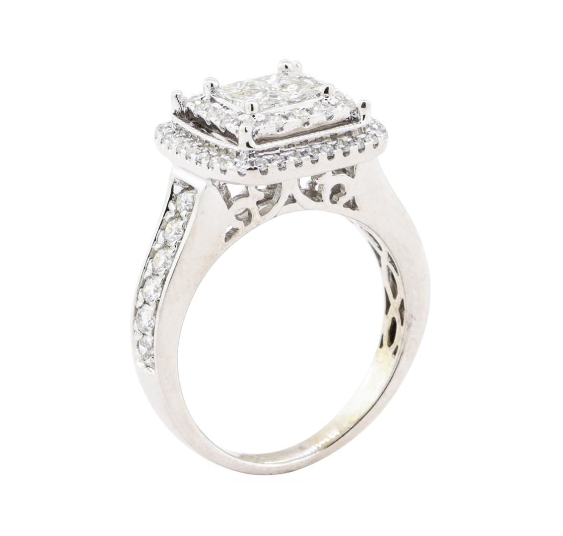 One electronically tested 14KT white gold lady's cast fashion ring with a square cushion halo with a bright polish with milgrain detailing finish. The featured lady's ring has a shank measuring 2.30 millimeters wide. Identified with markings of '14K'. Condition is new, good workmanship. Containing: Four invisible set princess cut diamonds, measuring 2.60 x 2.50 x 1.87mm (depth est.) approximate total weight of 4 Stones = 0.40ct. Graded in the setting. Color H - I Clarity SI-2 to I-1 Cut Good Twelve prong set round brilliant cut diamonds, measuring 2.00 - 1.90 x 1.21mm (depth est.) approximate total weight of 12 Stones = 0.35ct. Graded in the setting. Color H - I Clarity SI-1 to SI-2 Cut Good Sixteen prong set round brilliant cut diamonds, measuring 1.60 - 1.55 x 0.98mm (depth est.) approximate total weight of 16 Stones = 0.25ct. Graded in the setting. Color H - I Clarity SI-1 to SI-2 Cut Very Good Thirty-Six prong set round brilliant cut diamonds, measuring 1.10 - 1.00 x 0.65mm (depth est.) approximate total weight of 36 Stones = 0.15ct. Graded in the setting. Color H - I Clarity SI-1 to SI-2 Cut Very Good. Total Weight of Diamonds 1.15ct.. Total Weight of Ring 5.30gm GAS Appraised at $3510.00. GAS Appraised at $3,510.00.