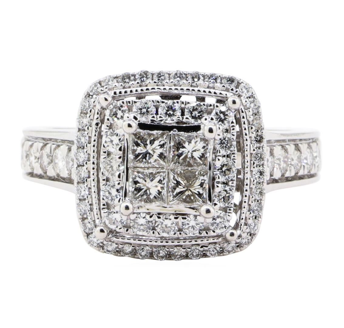 One electronically tested 14KT white gold lady's cast fashion ring with a square cushion halo with a bright polish with milgrain detailing finish. The featured lady's ring has a shank measuring 2.30 millimeters wide. Identified with markings of '14K'. Condition is new, good workmanship. Containing: Four invisible set princess cut diamonds, measuring 2.60 x 2.50 x 1.87mm (depth est.) approximate total weight of 4 Stones = 0.40ct. Graded in the setting. Color H - I Clarity SI-2 to I-1 Cut Good Twelve prong set round brilliant cut diamonds, measuring 2.00 - 1.90 x 1.21mm (depth est.) approximate total weight of 12 Stones = 0.35ct. Graded in the setting. Color H - I Clarity SI-1 to SI-2 Cut Good Sixteen prong set round brilliant cut diamonds, measuring 1.60 - 1.55 x 0.98mm (depth est.) approximate total weight of 16 Stones = 0.25ct. Graded in the setting. Color H - I Clarity SI-1 to SI-2 Cut Very Good Thirty-Six prong set round brilliant cut diamonds, measuring 1.10 - 1.00 x 0.65mm (depth est.) approximate total weight of 36 Stones = 0.15ct. Graded in the setting. Color H - I Clarity SI-1 to SI-2 Cut Very Good. Total Weight of Diamonds 1.15ct.. Total Weight of Ring 5.30gm GAS Appraised at $3510.00. GAS Appraised at $3,510.00.