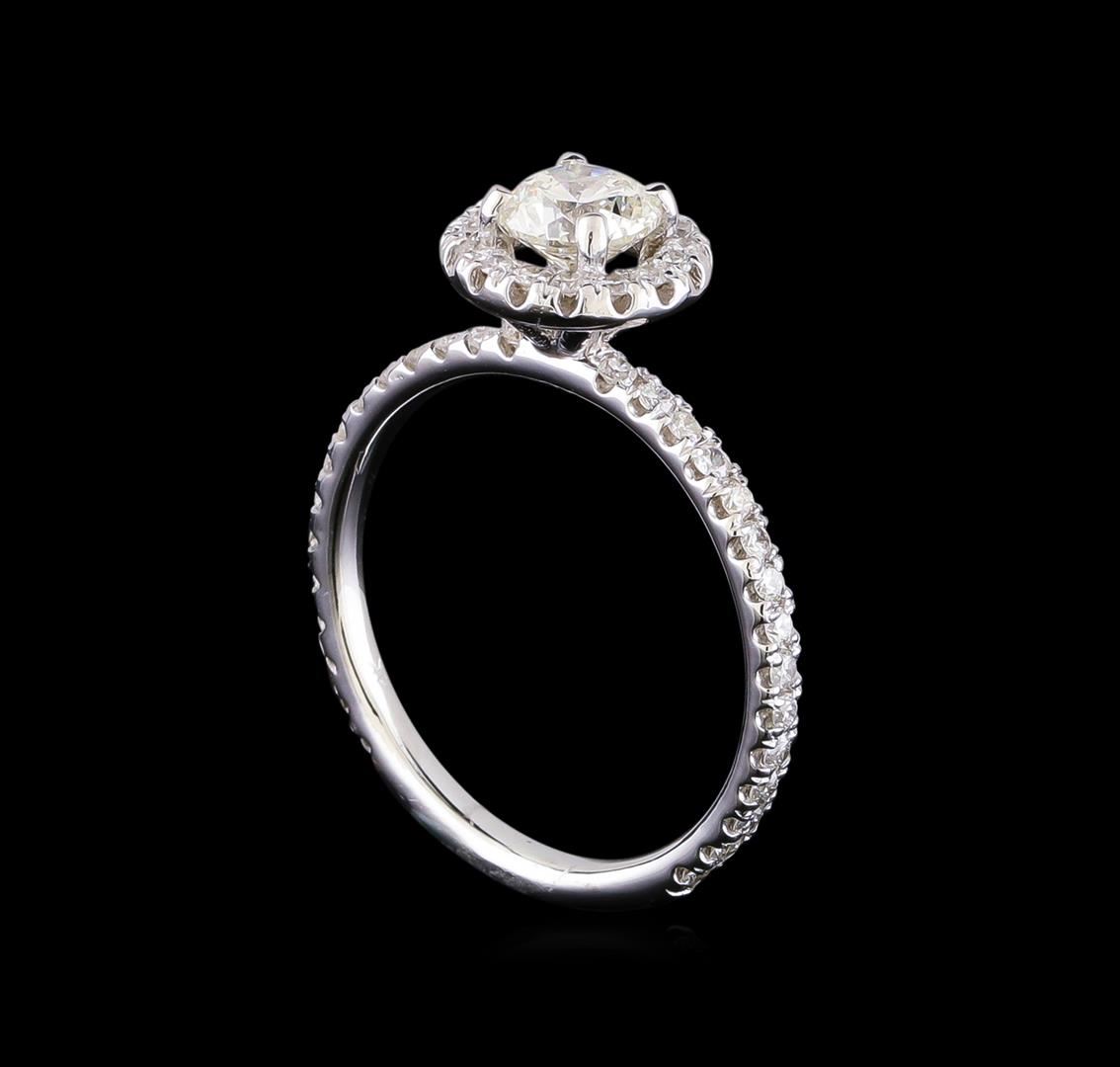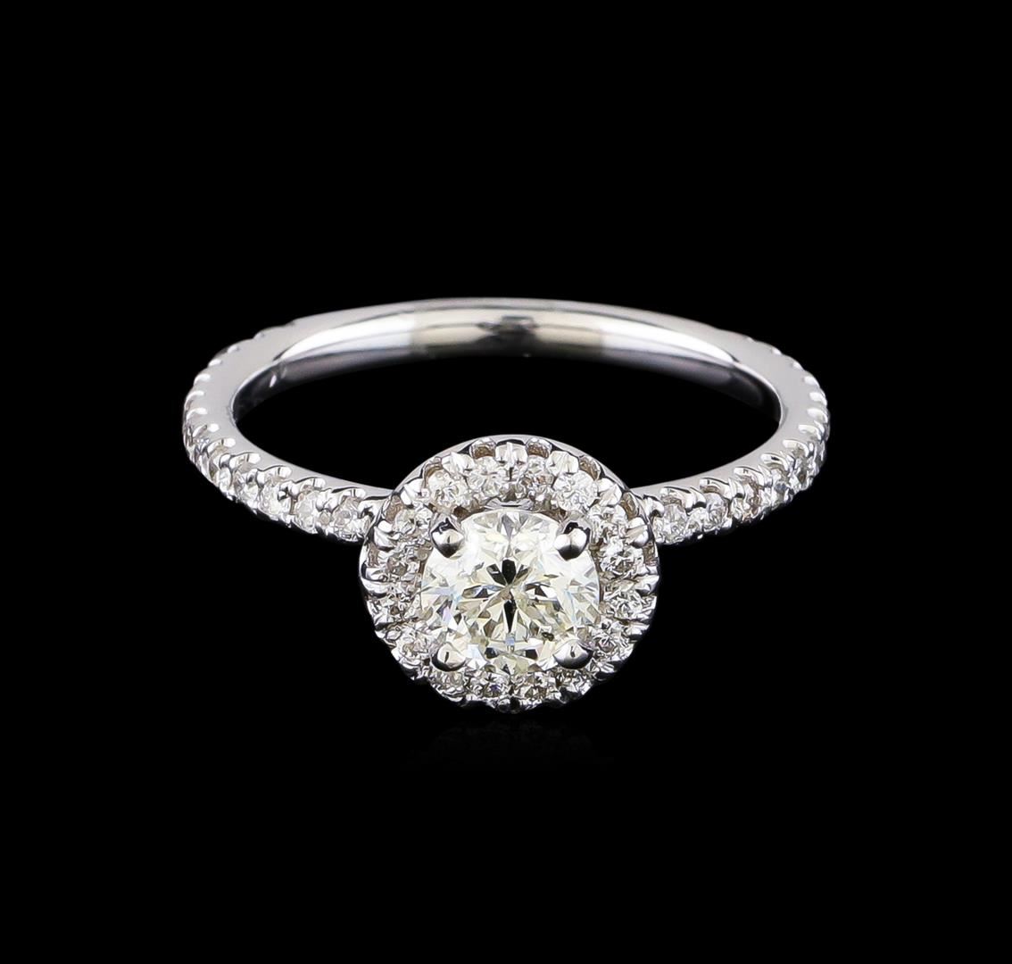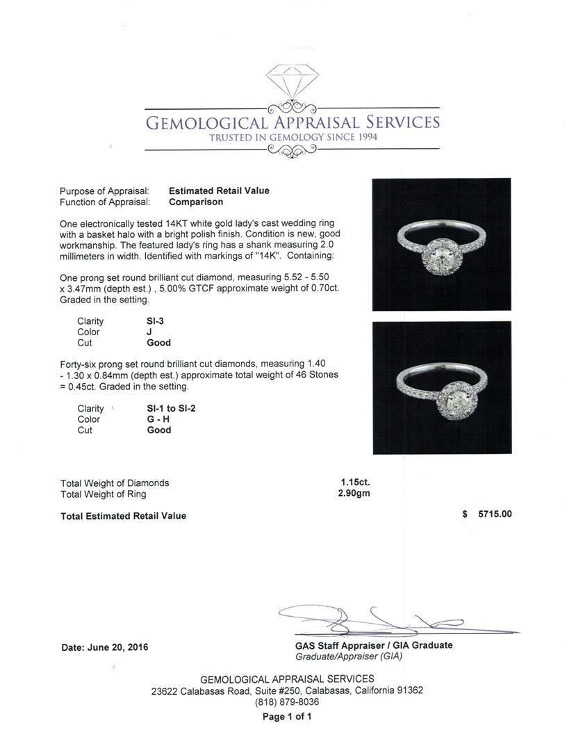 One electronically tested 14KT white gold lady's cast wedding ring with a basket halo with a bright polish finish. The featured lady's ring has a shank measuring 2.0 millimeters in width. Identified with markings of "14K". Condition is new, good workmanship. Containing: One prong set round brilliant cut diamond, measuring 5.52 - 5.50 x 3.47mm (depth est.) , 5.00.%. GTCF approximate weight of 0.70ct. Graded in the setting. Clarity: SI-3. Color: Good Forty-Six prong set round brilliant cut diamonds, measuring 1.40 - 1.30 x 0.84mm (depth est.) approximate total weight of 46 Stones = 0.45ct. Graded in the setting. Clarity: SI-1 to SI-2. Color: G - Good. Total Weight of Diamonds 1.15ct. Total Weight of Ring 2.90gm GAS Appraised at $5,715.00.