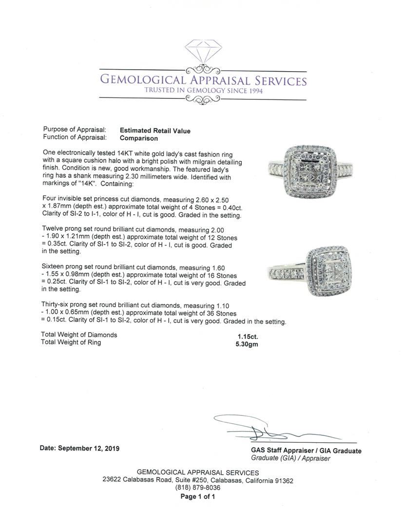 One electronically tested 14KT white gold lady's cast fashion ring with a square cushion halo with a bright polish with milgrain detailing finish. The featured lady's ring has a shank measuring 2.30 millimeters wide. Identified with markings of '14K'. Condition is new, good workmanship. Containing: Four invisible set princess cut diamonds, measuring 2.60 x 2.50 x 1.87mm (depth est.) approximate total weight of 4 Stones = 0.40ct. Graded in the setting. Color H - I Clarity SI-2 to I-1 Cut Good Twelve prong set round brilliant cut diamonds, measuring 2.00 - 1.90 x 1.21mm (depth est.) approximate total weight of 12 Stones = 0.35ct. Graded in the setting. Color H - I Clarity SI-1 to SI-2 Cut Good Sixteen prong set round brilliant cut diamonds, measuring 1.60 - 1.55 x 0.98mm (depth est.) approximate total weight of 16 Stones = 0.25ct. Graded in the setting. Color H - I Clarity SI-1 to SI-2 Cut Very Good Thirty-Six prong set round brilliant cut diamonds, measuring 1.10 - 1.00 x 0.65mm (depth est.) approximate total weight of 36 Stones = 0.15ct. Graded in the setting. Color H - I Clarity SI-1 to SI-2 Cut Very Good. Total Weight of Diamonds 1.15ct.. Total Weight of Ring 5.30gm GAS Appraised at $3510.00. GAS Appraised.