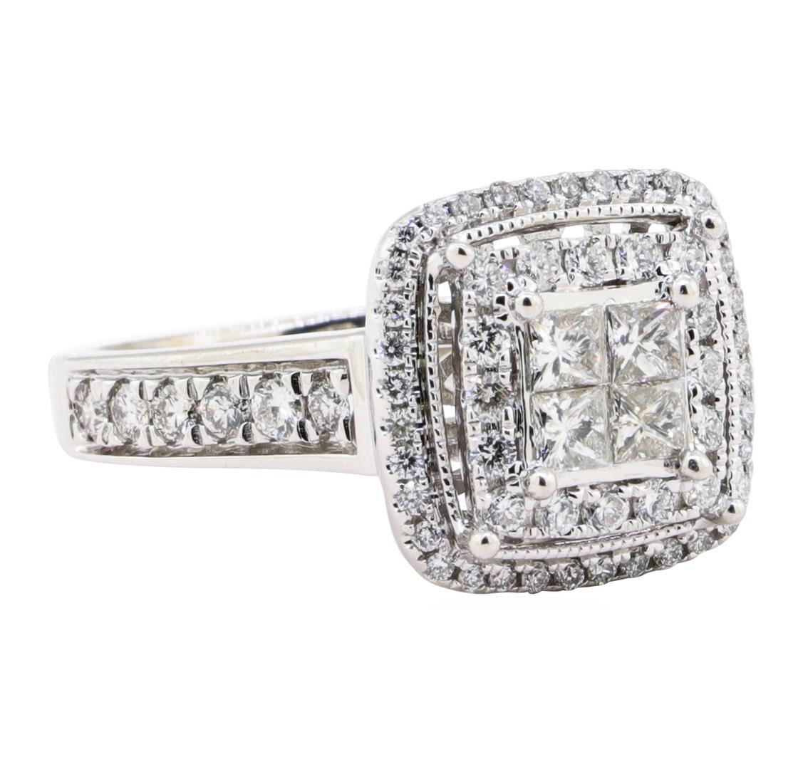 One electronically tested 14KT white gold lady's cast fashion ring with a square cushion halo with a bright polish with milgrain detailing finish. The featured lady's ring has a shank measuring 2.30 millimeters wide. Identified with markings of '14K'. Condition is new, good workmanship. Containing: Four invisible set princess cut diamonds, measuring 2.60 x 2.50 x 1.87mm (depth est.) approximate total weight of 4 Stones = 0.40ct. Graded in the setting. Color H - I Clarity SI-2 to I-1 Cut Good Twelve prong set round brilliant cut diamonds, measuring 2.00 - 1.90 x 1.21mm (depth est.) approximate total weight of 12 Stones = 0.35ct. Graded in the setting. Color H - I Clarity SI-1 to SI-2 Cut Good Sixteen prong set round brilliant cut diamonds, measuring 1.60 - 1.55 x 0.98mm (depth est.) approximate total weight of 16 Stones = 0.25ct. Graded in the setting. Color H - I Clarity SI-1 to SI-2 Cut Very Good Thirty-Six prong set round brilliant cut diamonds, measuring 1.10 - 1.00 x 0.65mm (depth est.) approximate total weight of 36 Stones = 0.15ct. Graded in the setting. Color H - I Clarity SI-1 to SI-2 Cut Very Good. Total Weight of Diamonds 1.15ct.. Total Weight of Ring 5.30gm GAS Appraised at  $3510.00. GAS Appraised.