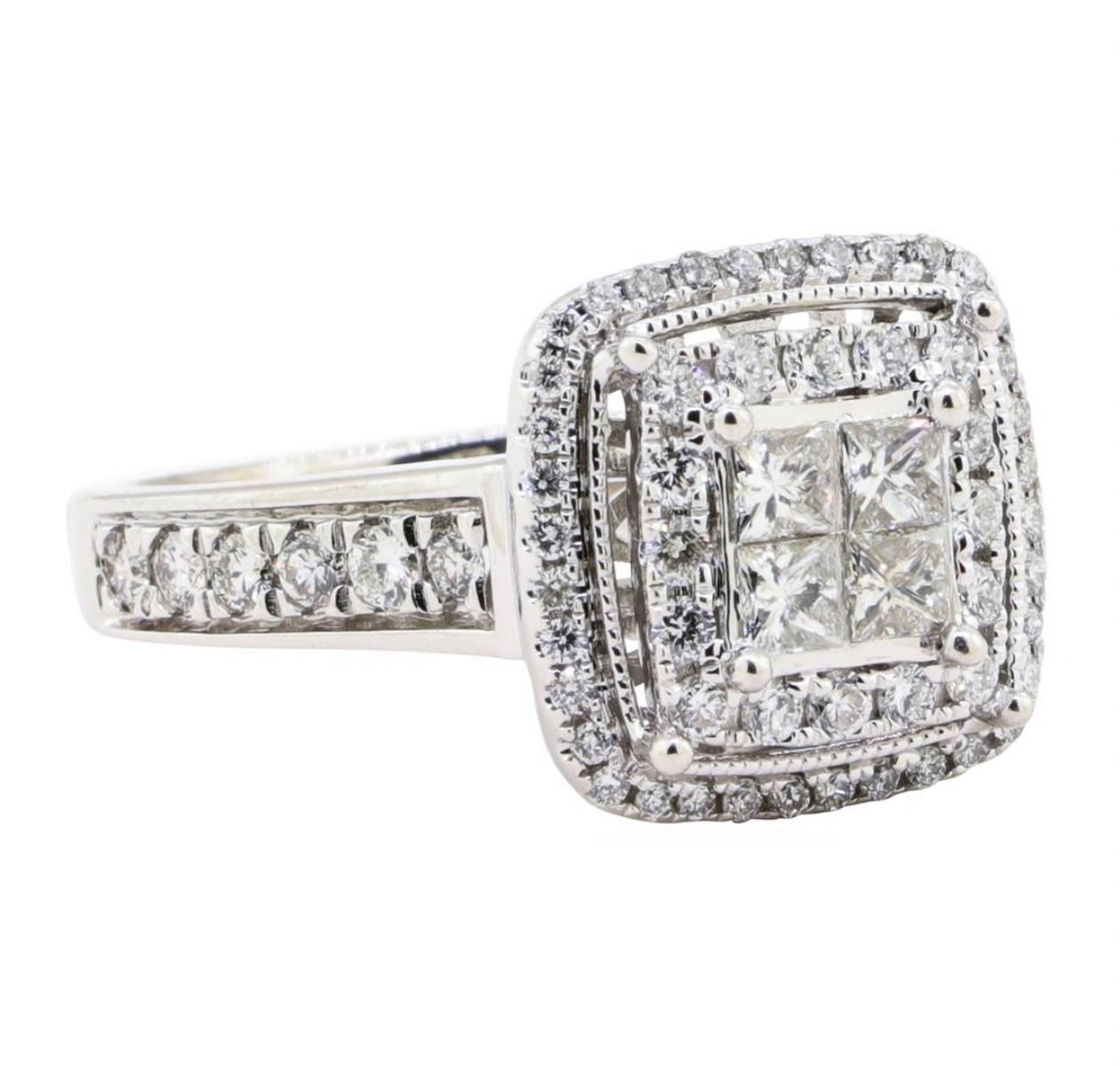 One electronically tested 14KT white gold lady's cast fashion ring with a square cushion halo with a bright polish with milgrain detailing finish. The featured lady's ring has a shank measuring 2.30 millimeters wide. Identified with markings of '14K'. Condition is new, good workmanship. Containing: Four invisible set princess cut diamonds, measuring 2.60 x 2.50 x 1.87mm (depth est.) approximate total weight of 4 Stones = 0.40 ct. Graded in the setting. Color H - I Clarity SI-2 to I-1 Cut Good Twelve prong set round brilliant cut diamonds, measuring 2.00 - 1.90 x 1.21mm (depth est.) approximate total weight of 12 Stones = 0.35ct. Graded in the setting. Color H - I Clarity SI-1 to SI-2 Cut Good Sixteen prong set round brilliant cut diamonds, measuring 1.60 - 1.55 x 0.98mm (depth est.) approximate total weight of 16 Stones = 0.25ct. Graded in the setting. Color H - I Clarity SI-1 to SI-2 Cut Very Good Thirty-Six prong set round brilliant cut diamonds, measuring 1.10 - 1.00 x 0.65mm (depth est.) approximate total weight of 36 Stones = 0.15ct. Graded in the setting. Color H - I Clarity SI-1 to SI-2 Cut Very Good. Total Weight of Diamonds 1.15ct.. Total Weight of Ring 5.30gm GAS Appraised at  $3510.00. GAS Appraised.