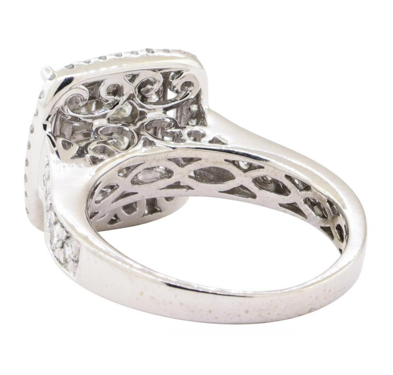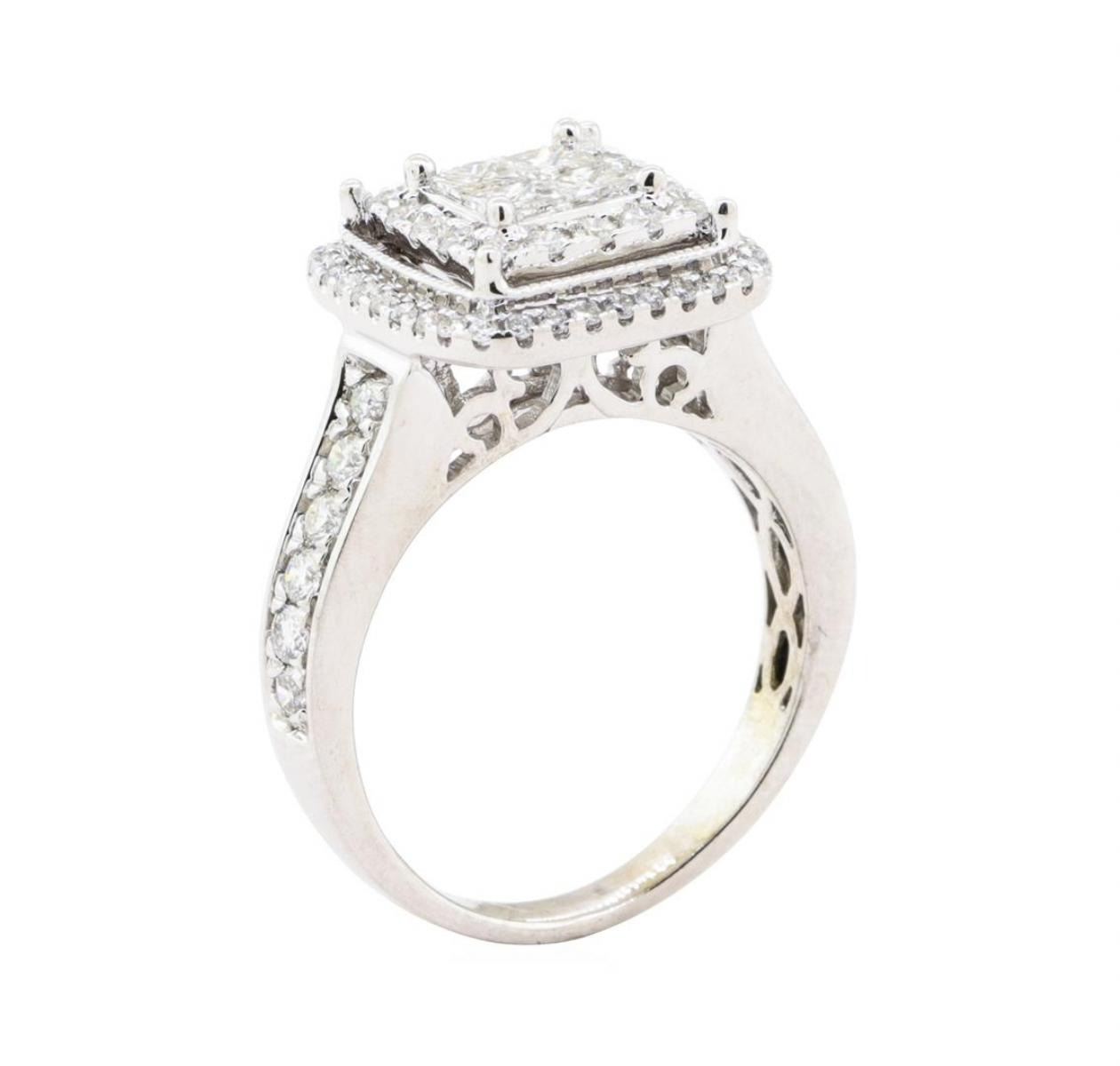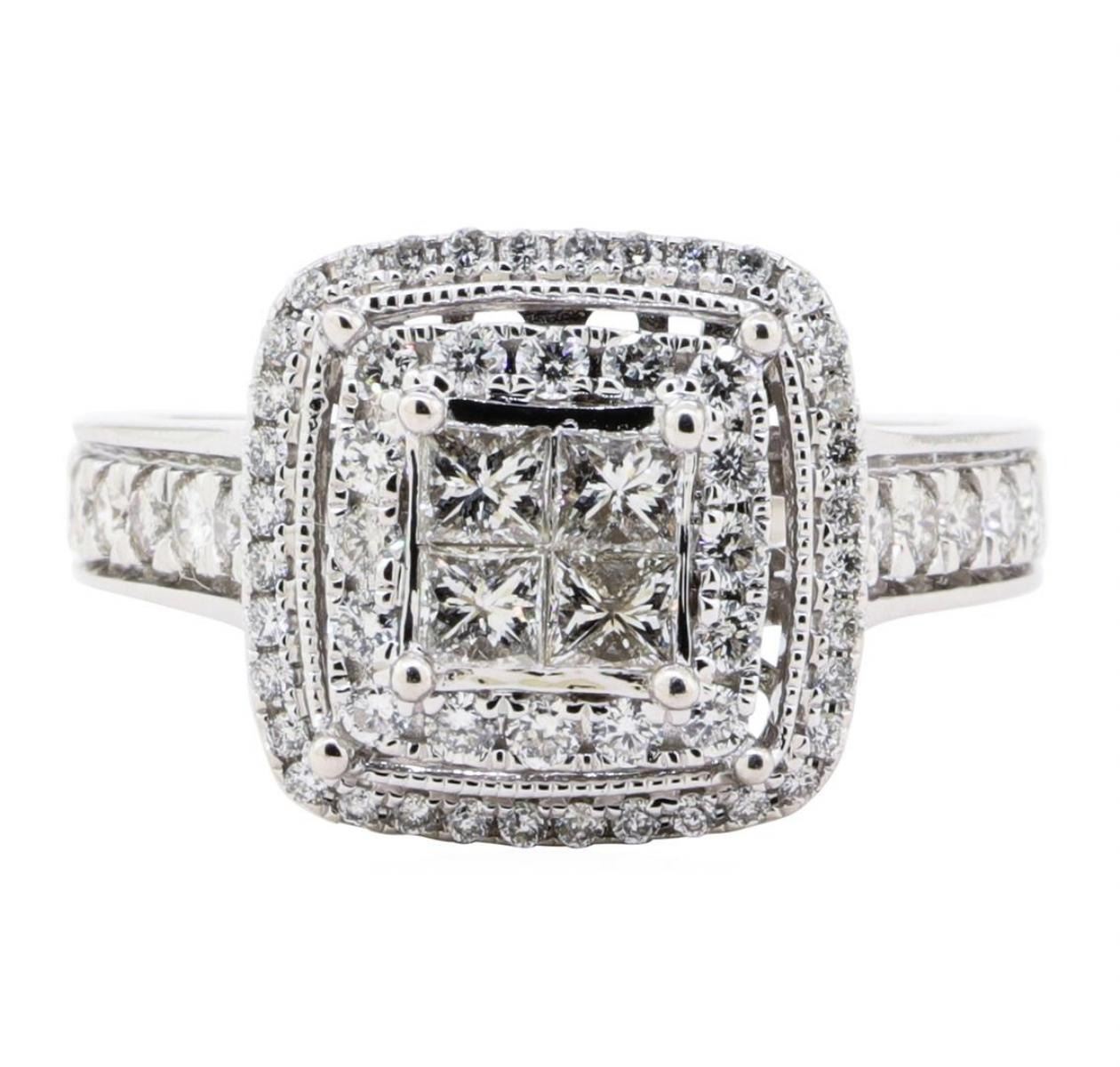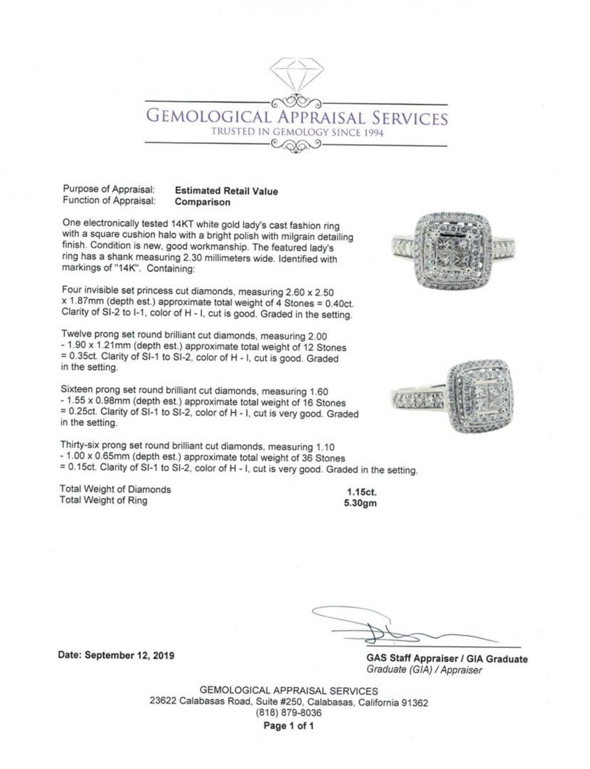 One electronically tested 14KT white gold lady's cast fashion ring with a square cushion halo with a bright polish with milgrain detailing finish. The featured lady's ring has a shank measuring 2.30 millimeters wide. Identified with markings of '14K'. Condition is new, good workmanship. Containing: Four invisible set princess cut diamonds, measuring 2.60 x 2.50 x 1.87mm (depth est.) approximate total weight of 4 Stones = 0.40 ct. Graded in the setting. Color H - I Clarity SI-2 to I-1 Cut Good Twelve prong set round brilliant cut diamonds, measuring 2.00 - 1.90 x 1.21mm (depth est.) approximate total weight of 12 Stones = 0.35ct. Graded in the setting. Color H - I Clarity SI-1 to SI-2 Cut Good Sixteen prong set round brilliant cut diamonds, measuring 1.60 - 1.55 x 0.98mm (depth est.) approximate total weight of 16 Stones = 0.25ct. Graded in the setting. Color H - I Clarity SI-1 to SI-2 Cut Very Good Thirty-Six prong set round brilliant cut diamonds, measuring 1.10 - 1.00 x 0.65mm (depth est.) approximate total weight of 36 Stones = 0.15ct. Graded in the setting. Color H - I Clarity SI-1 to SI-2 Cut Very Good. Total Weight of Diamonds 1.15ct.. Total Weight of Ring 5.30gm GAS Appraised at $3510.00. GAS Appraised.
