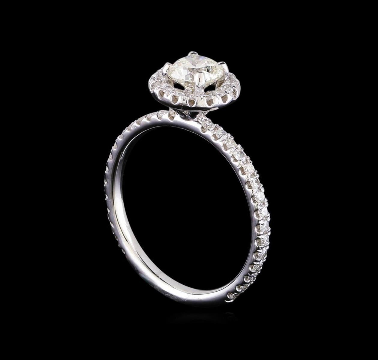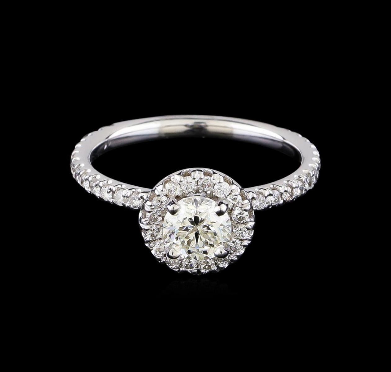 One electronically tested 14KT white gold lady's cast wedding ring with a basket halo with a bright polish finish. The featured lady's ring has a shank measuring 2.0 millimeters in width. Identified with markings of "14K". Condition is new, good workmanship. Containing: One prong set round brilliant cut diamond, measuring 5.52 - 5.50 x 3.47mm (depth est.) , 5.00.%. GTCF approximate weight of 0.70ct. Graded in the setting. Clarity: SI-3. Color: Good Forty-Six prong set round brilliant cut diamonds, measuring 1.40 - 1.30 x 0.84mm (depth est.) approximate total weight of 46 Stones = 0.45ct. Graded in the setting. Clarity: SI-1 to SI-2. Color: G - Good. Total Weight of Diamonds 1.15ct. Total Weight of Ring 2.90gm GAS Appraised.