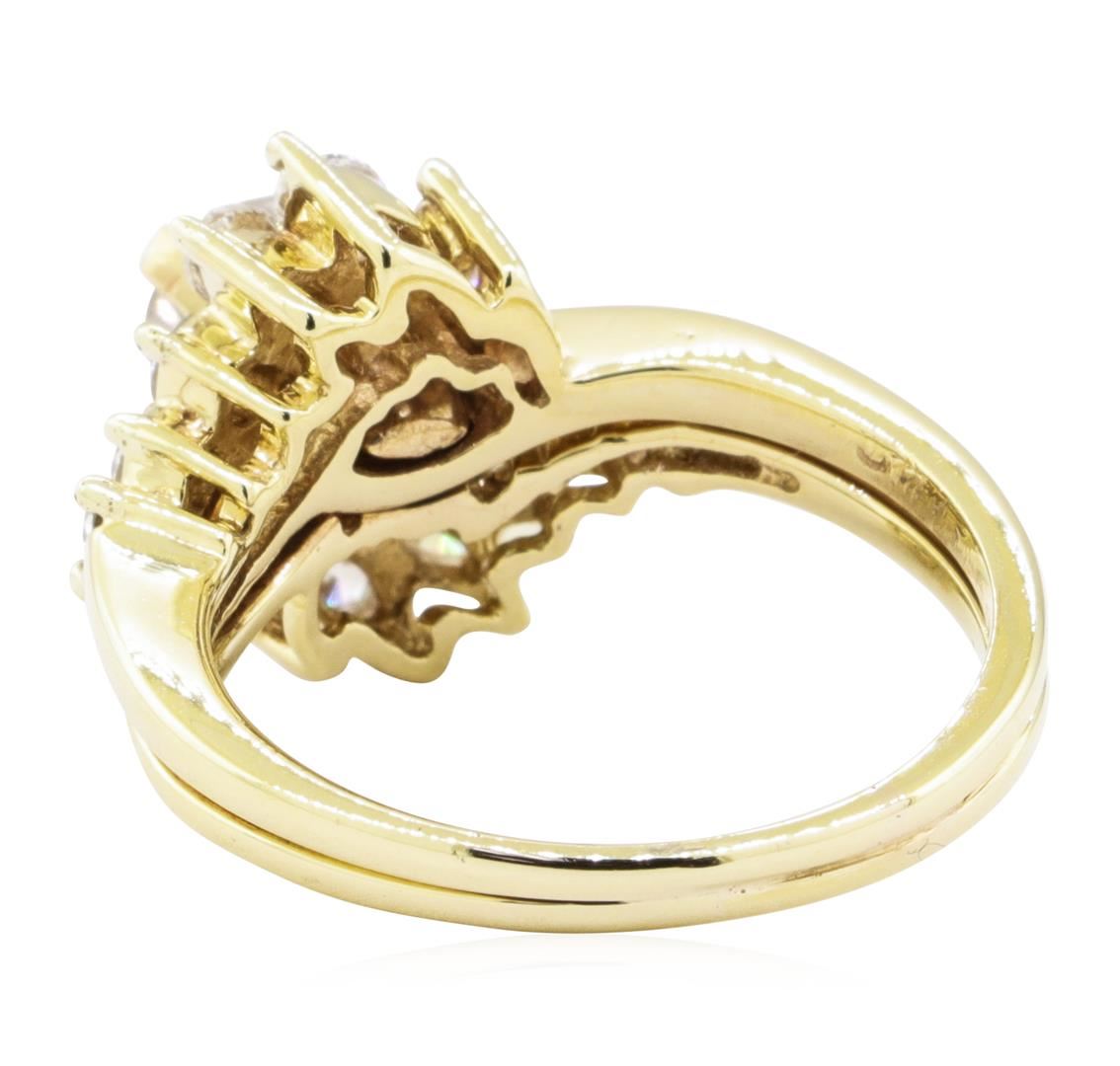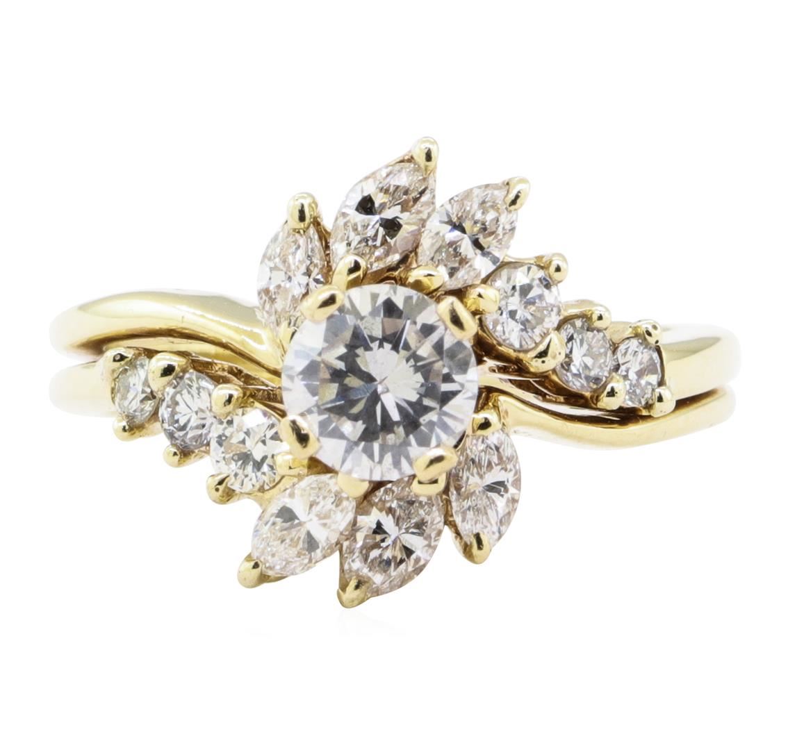 One electronically tested 14KT yellow gold lady's combination cast & assembled wedding ring with a bypass starburst motif with a bright polish finish. The featured lady's ring has a double shank measuring 1.95 millimeters wide. Condition is new, good workmanship. Containing: One prong set round brilliant cut diamond, measuring 5.19 - 5.17 x 3.11mm (depth est.) approximate weight of 0.50ct. Graded in the setting. Color H Clarity SI-1 Cut Good Six prong set marquise shaped cut diamonds, measuring 3.70 x 2.25 x 1.42mm (depth est.) approximate total weight of 6 Stones = 0.40ct. Graded in the setting. Color H - I Clarity VS-2 to SI-1 Cut Good Six prong set round brilliant cut diamonds, measuring 2.40 - 2.10 x 1.35mm (depth est.) approximate total weight of 6 Stones = 0.25ct. Graded in the setting. Color H - I Clarity SI-1 to SI-2 Cut Good. Total Weight of Diamonds 1.15ct.. Total Weight of Ring 4.70gm GAS Appraised at $5105.00. GAS Appraised.