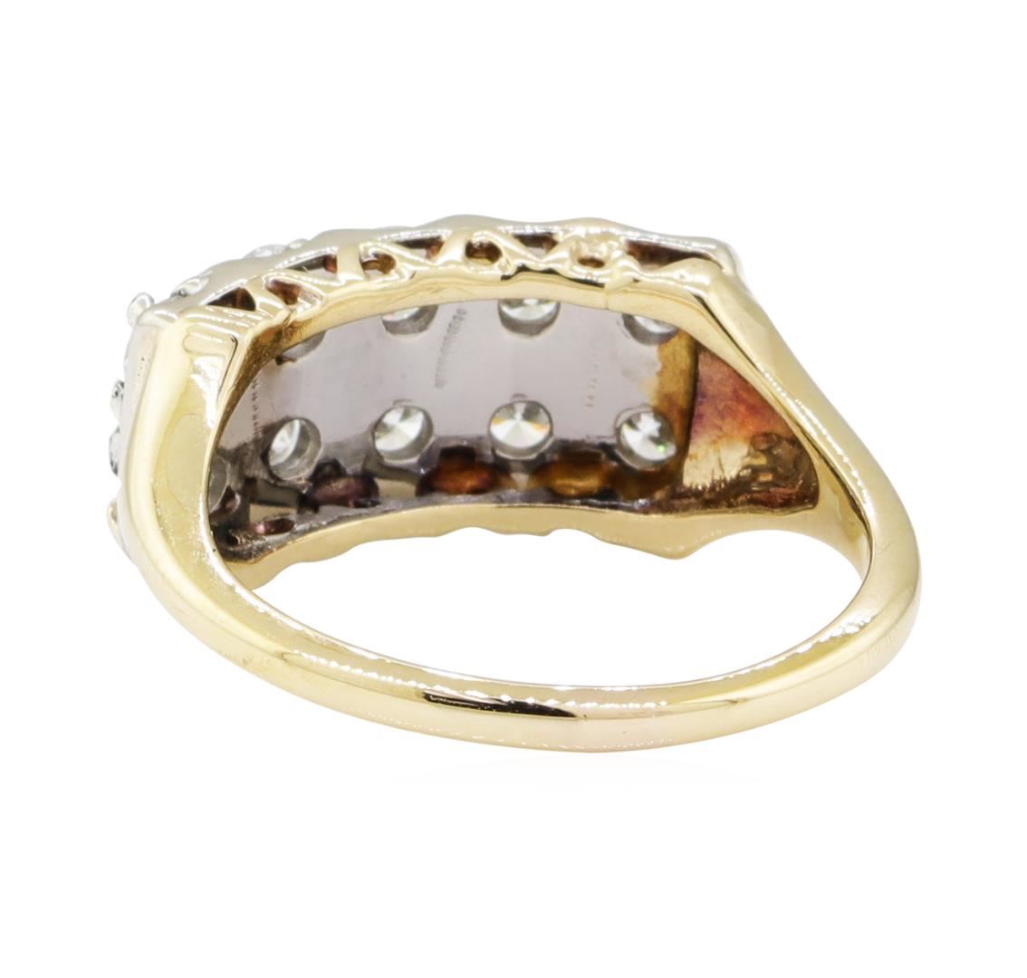 One electronically tested 14KT yellow and white gold lady's combination cast & assembled fashion anniversary ring with a doulbe row motif with a bright polish finish. The featured lady's ring has a shank measuring 1.68 millimeters wide. Identified with markings of '14K'. Condition is used, good workmanship. Containing: Ten prong set round brilliant cut diamonds, measuring 3.20 - 3.00 x 1.92mm (depth est.) approximate total weight of 10 Stones = 1.15ct. Graded in the setting. Color H - I Clarity VS-1 to VS-2 Cut Very Good. Total Weight of Diamonds 1.15ct.. Total Weight of Ring 4.40gm GAS Appraised at $4025.00. GAS Appraised at $4,025.00.