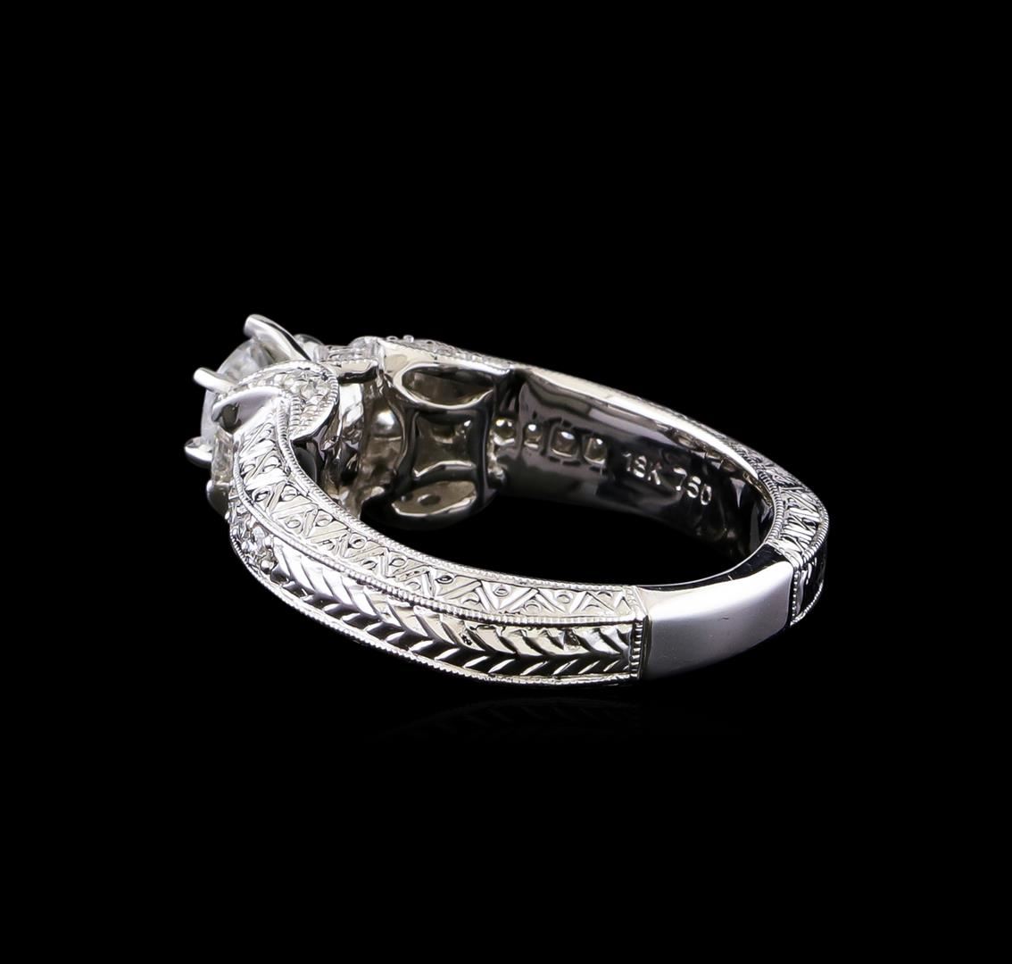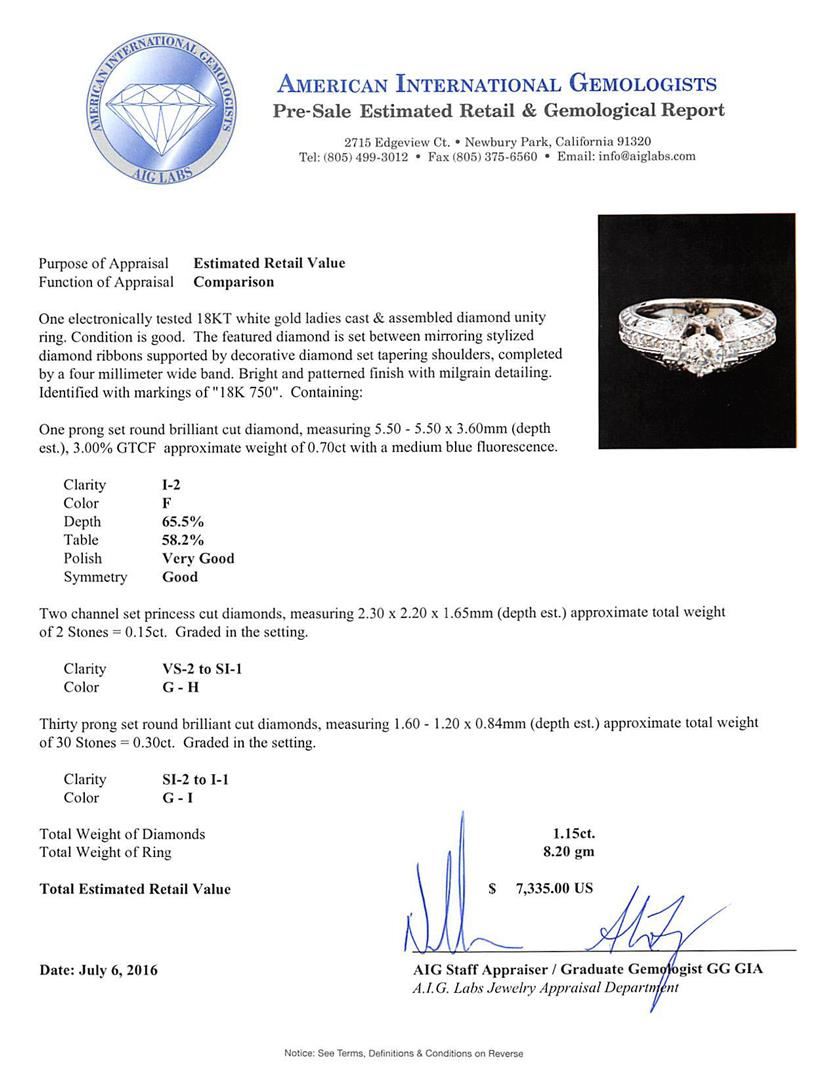 One electronically tested 18KT white gold ladies cast & assembled diamond unity ring. The featured diamond is set between mirroring stylized diamond ribbons supported by decorative diamond set tapering shoulders, completed by a four millimeter wide band. Bright and patterned finish with milgrain detailing. Identified with markings of "18K 750". Condition is good. Containing: One prong set round brilliant cut diamond, measuring 5.50 - 5.50 x 3.60mm (depth est.), 3.00.%. GTCF approximate weight of 0.70ct with a medium blue fluorescence. Clarity: I-2. Color: F. Depth 65.5%. Table 58.2%. Two channel set princess cut diamonds, measuring 2.30 x 2.20 x 1.65mm (depth est.) approximate total weight of 2 Stones = 0.15ct. Graded in the setting. Clarity: VS-2 to SI-1. Color: G - H Thirty prong set round brilliant cut diamonds, measuring 1.60 - 1.20 x 0.84mm (depth est.) approximate total weight of 30 Stones = 0.30ct. Graded in the setting. Clarity: SI-2 to I-1. Color: G - I. Total Weight of Diamonds 1.15ct. Total Weight of Ring 8.20gm. AIG Appraised at $7,335.00.
