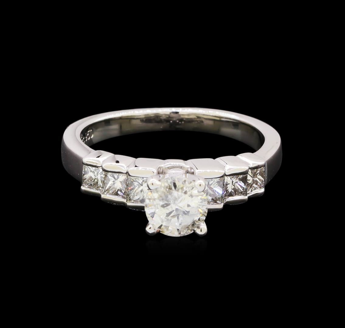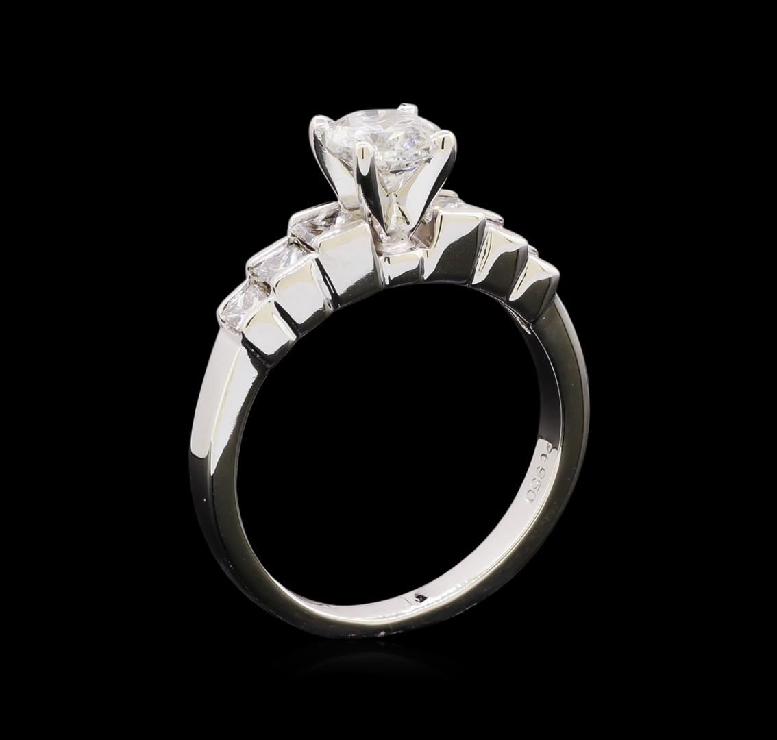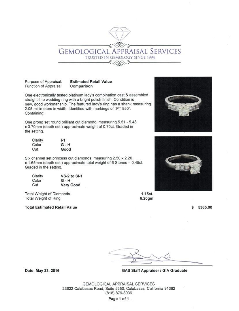 One electronically tested platinum lady's combination cast & assembled straight line wedding ring with a bright polish finish. The featured lady's ring has a shank measuring 2.05 millimeters in width. Identified with markings of "PT 950". Condition is new, good workmanship. Containing: One prong set round brilliant cut diamond, measuring 5.51 - 5.48 x 3.70mm (depth est.) approximate weight of 0.70ct. Graded in the setting. Clarity: I-1. Color: G - Good Six channel set princess cut diamonds, measuring 2.50 x 2.20 x 1.65mm (depth est.) approximate total weight of 6 Stones = 0.45ct. Graded in the setting. Clarity: VS-2 to SI-1. Color: G - Very Good. Total Weight of Diamonds 1.15ct. Total Weight of Ring 6.20gm. GAS Appraised at $5,365.00.