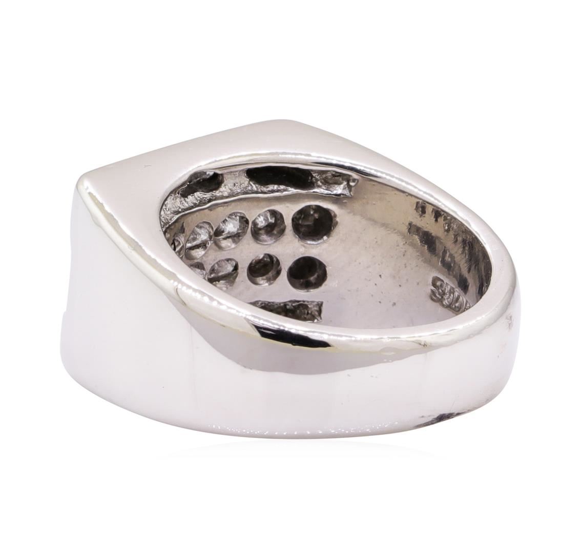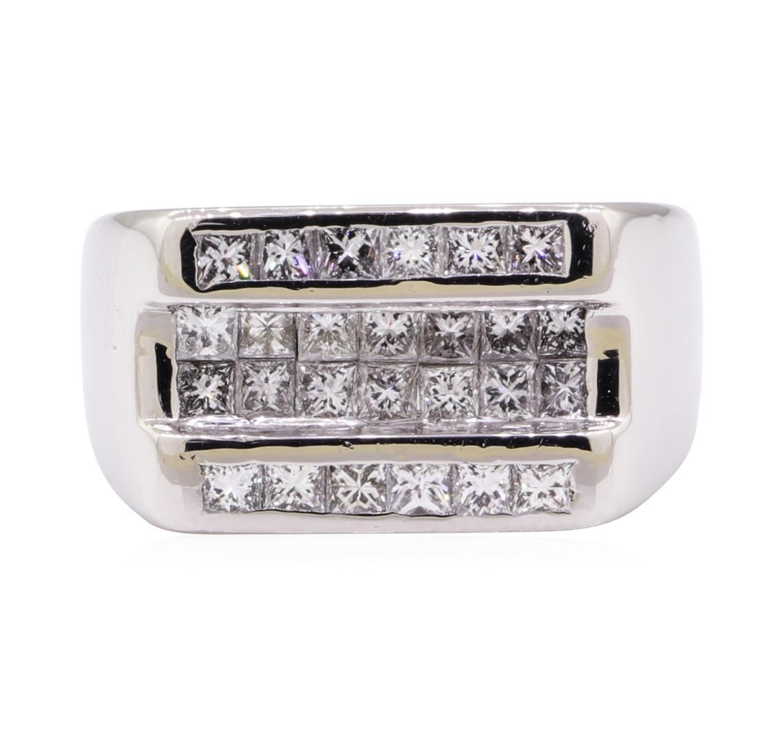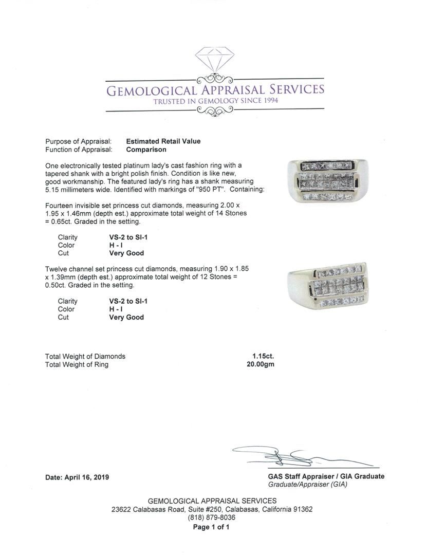 One electronically tested platinum lady's cast fashion ring with a tapered shank with a bright polish finish. The featured lady's ring has a shank measuring 5.15 millimeters wide. Identified with markings of '950 PT'. Condition is like new, good workmanship. Containing: Fourteen invisible set princess cut diamonds, measuring 2.00 x 1.95 x 1.46mm (depth est.) approximate total weight of 14 Stones = 0.65ct. Graded in the setting. Color H - I Clarity VS-2 to SI-1 Cut Very Good Twelve channel set princess cut diamonds, measuring 1.90 x 1.85 x 1.39mm (depth est.) approximate total weight of 12 Stones = 0.50ct. Graded in the setting. Color H - I Clarity VS-2 to SI-1 Cut Very Good. Total Weight of Diamonds 1.15ct.. Total Weight of Ring 20.00gm GAS Appraised at $5160.00. GAS Appraised at $5,160.00.