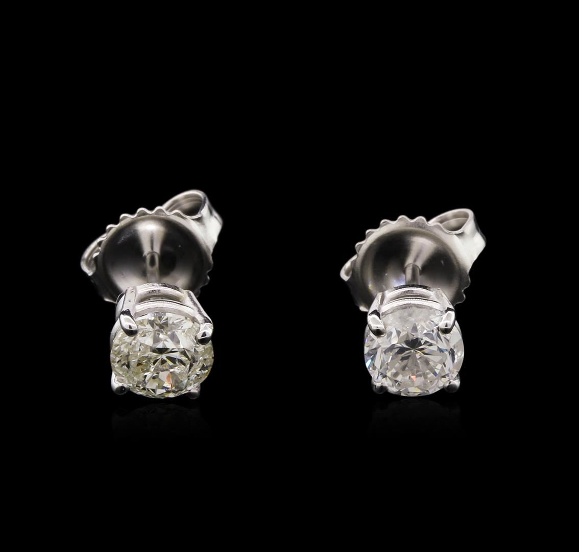 One pair electronically tested 14KT white gold cast & assembled diamond solitaire earrings with standard backs. Identified with markings of "14K". Condition is new, good workmanship. Containing: One prong set round brilliant cut diamond, measuring 5.10 - 5.10 x 3.40mm (depth est.), 5.00% GTCF approximate weight of 0.57ct. Graded in the setting. Clarity: I-2. Color: I. Depth 66.7%. Table 56.9%. One prong set round brilliant cut diamond, measuring 5.20 - 5.20 x 3.35mm (depth est.), 4.00% GTCF approximate weight of 0.58ct. Graded in the setting. Clarity: I-2. Color: K. Depth 64.4%. Table 63.5%. Total Weight of Diamonds 1.15ct. Total Weight of Earrings 1.19gm. AIG Appraised at $3,525.00.