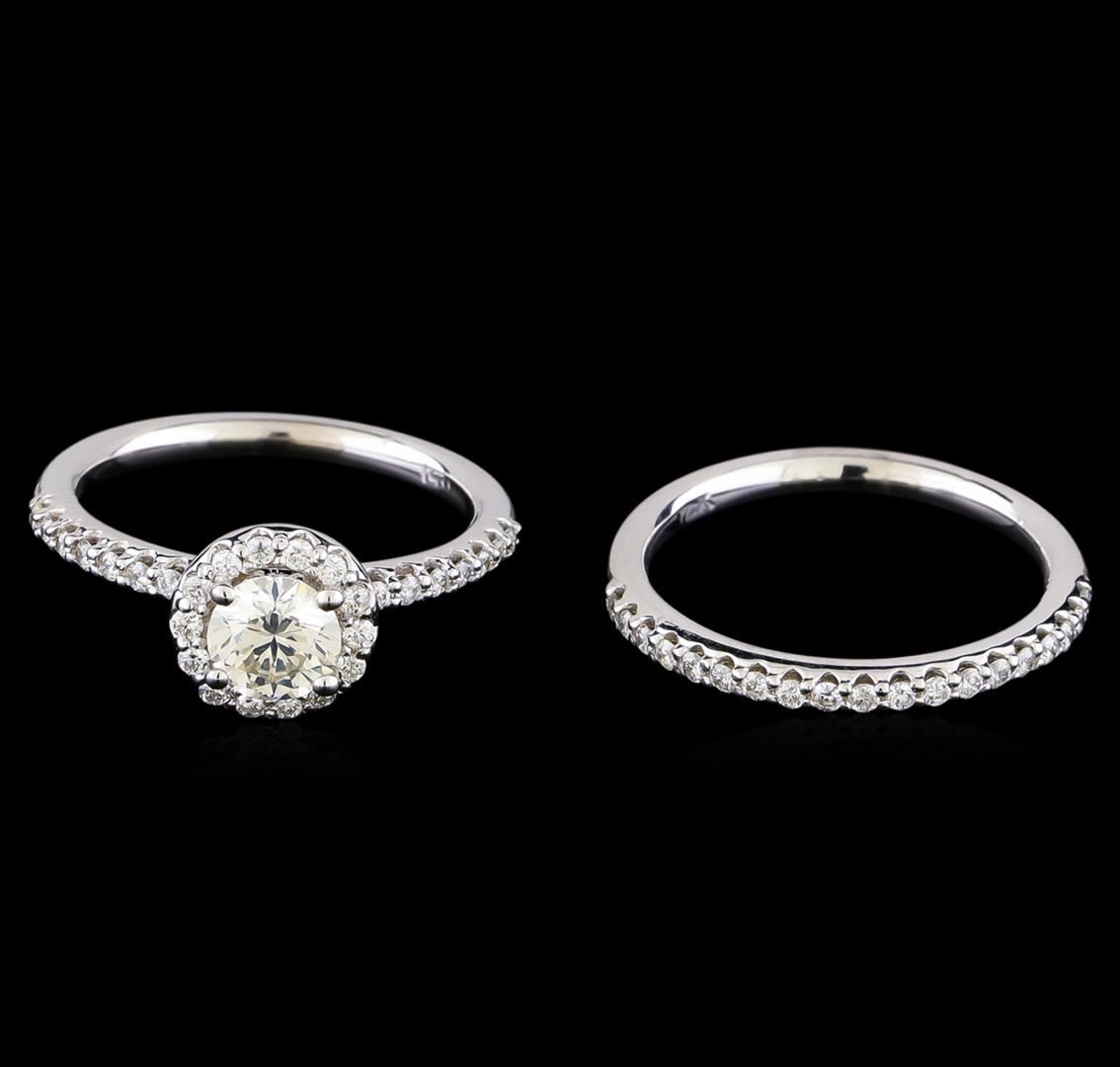 One electronically tested 14KT white gold lady's cast wedding set rings with a halo with a bright polish finish. The featured lady's ring set has a double shank measuring 3.90 millimeters in width. Identified with markings of "14K". Condition is new, good workmanship. Containing: One prong set round brilliant cut diamond, measuring 5.68 - 5.59 x 3.81mm (depth est.) approximate weight of 0.67ct. Graded in the setting. Clarity: SI-1. Color: I. Cut Very Good Forty-Nine prong set round brilliant cut diamonds, measuring 1.40 - 1.30 x 0.84mm (depth est.) approximate total weight of 49 Stones = 0.48ct. Graded in the setting. Clarity: VS-2 to SI-2. Color: G - Good. Total Weight of Diamonds 1.15ct. Total Weight of Rings 5.70gm GAS Appraised at $6,445.00.