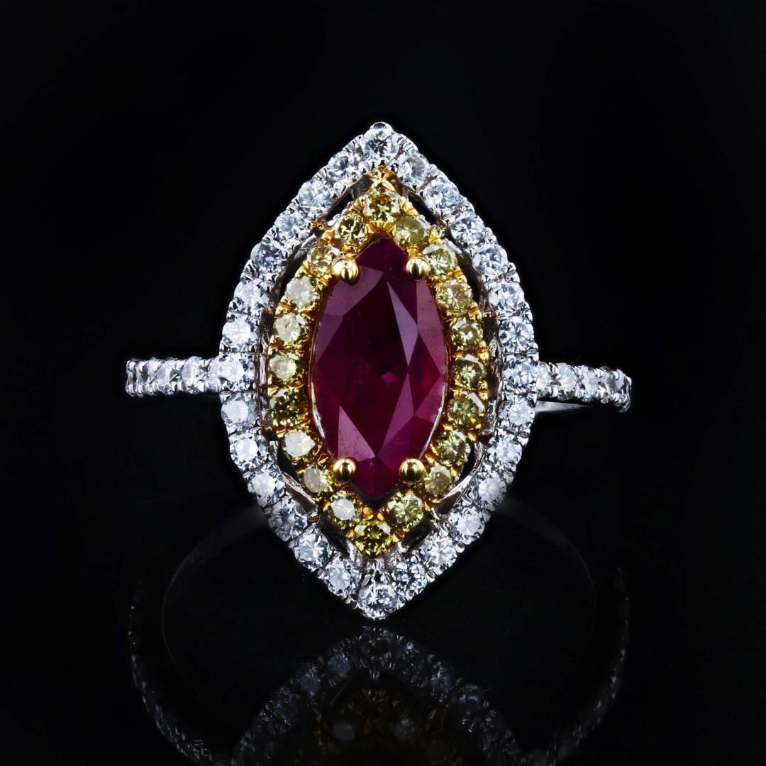 One electronically tested 18KT white & yellow gold ladies cast ruby & diamond ring. The featured ruby is set within an inner yellow diamond bezel, and an outer white diamond bezel, supported by a ribbed under gallery and diamond shoulders, completed by a one millimeter wide band. Bright polish finish. Condition is new, good workmanship. Trademark is Orianne. Identified with markings of "18K". One prong set marquise mixed cut natural ruby approximate weight of I.15ct., clarity is heavily included, type II, dark, slightly brownish, red color, (GIA R 7/2), cut is good. Transmitting light with some distortion, transparent to translucent. Naturally occurring internal & external characteristics are present. Graded in the setting. Twenty prong set round brilliant cut diamonds, measuring 1.50 - 1.40 x 0.88mm (depth est.) approximate total weight of 20 Stones = 0.22ct. The clarity & color grade reflect the overall average for the group. Graded in the setting. Clarity SI-1 to I-1; Color Fancy Yellow; Seventy-six prong set round brilliant cut diamonds approximate total weight of 76 Stones = 0.79ct. The clarity & color grade reflect the overall average for the group. The diamond count is approximate. Graded in the setting. Clarity SI-1 to I-1; Color F - H #Size: 6.75