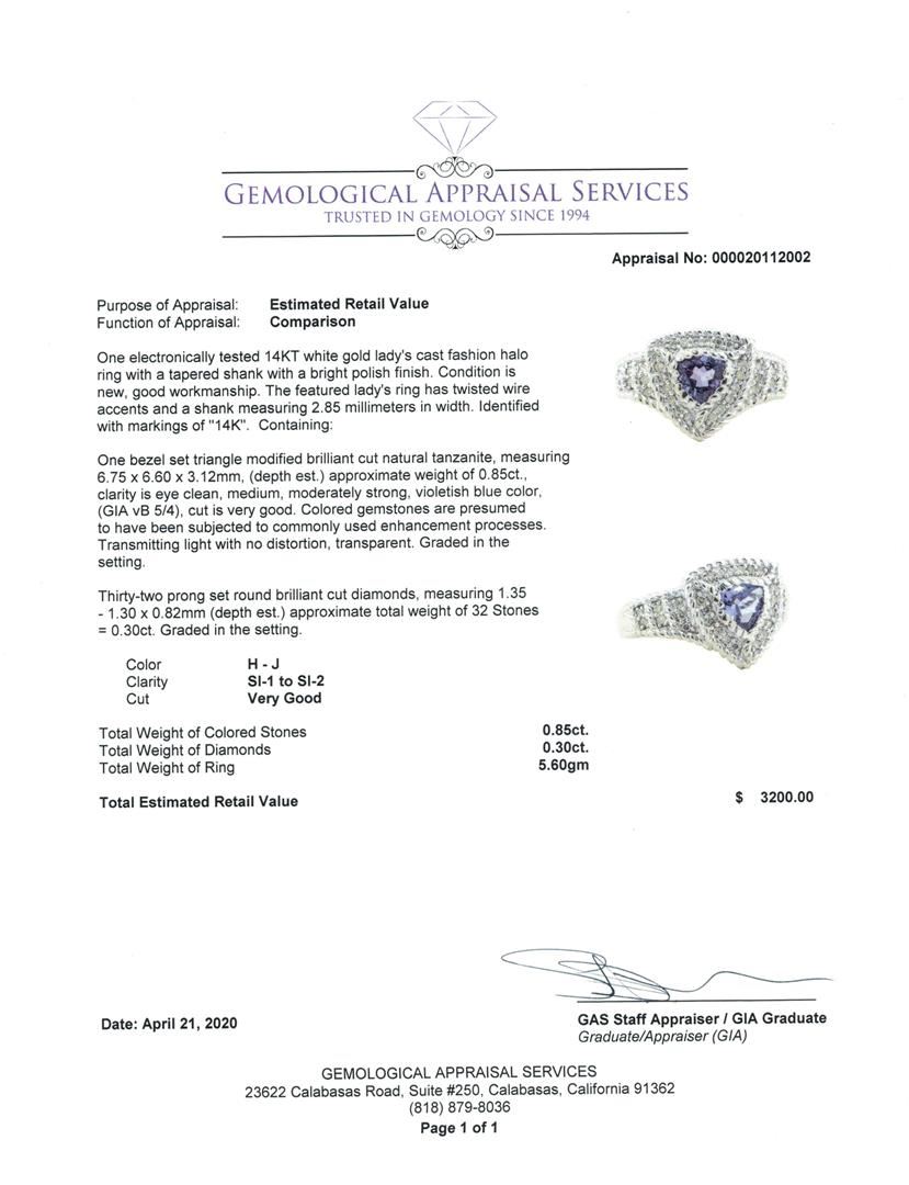 One electronically tested 14KT white gold lady's cast fashion halo ring with a tapered shank with a bright polish finish. The featured lady's ring has twisted wire accents and a shank measuring 2.85 millimeters in width. Identified with markings of '14K'. Condition is new, good workmanship. Containing: One bezel set triangle modified brilliant cut natural tanzanite, measuring 6.75 x 6.60 x 3.12mm, (depth est.) approximate weight of 0.85ct., clarity is eye clean, medium, moderately strong, violetish blue color, (GIA vB 5/4), cut is very good. Colored gemstones are presumed to have been subjected to commonly used enhancement processes. Transmitting light with no distortion, transparent. Graded in the setting. Thirty-Two prong set round brilliant cut diamonds, measuring 1.35 - 1.30 x 0.82mm (depth est.) approximate total weight of 32 Stones = 0.30 ct. Graded in the setting. Color H - J Clarity SI-1 to SI-2 Cut Very Good. Total Weight of Colored Stones 0.85ct.. Total Weight of Diamonds 0.30 ct.. Total Weight of Ring 5.60gm GAS Appraised at $3200.00. GAS Appraised.