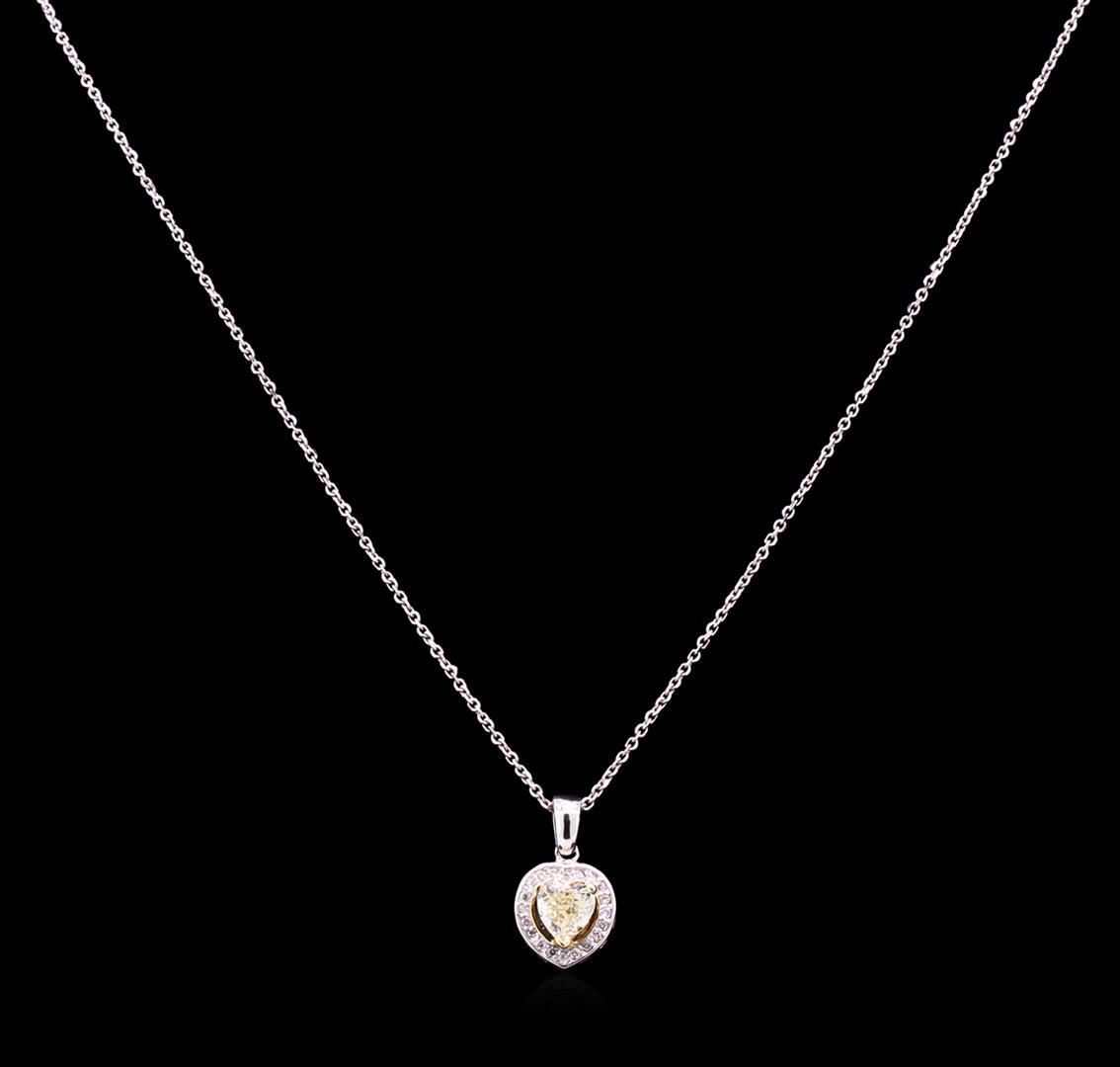 One electronically tested 14KT white gold ladies cast & assembled diamond pendant and chain. The pendant features a heart shaped diamond set within a diamond bezel, completed by a white gold bail. The pendant is supported by an eighteen inch length 14KT white gold designer style chain, terminating in a lobster claw clasp. Bright polish finish with yellow gold accents. Identified with markings of "14K". Condition is new, good workmanship. Containing: One prong set heart shaped cut diamond, measuring 6.50 x 6.00 x 3.78mm, 15.00% GTCF exact weight 1.00ct with a strong blue fluorescence. Graded in the setting. Clarity: SI-2. Depth: 63.0%. Table 58.3%. Twenty prong set round brilliant cut diamonds, measuring 1.30 - 1.30 x 0.78mm exact total weight 20 Stones = 0.15ct. Graded in the setting. Clarity: SI-2 to I-1. Color: G - I. Total Weight of Diamonds 1.15ct. Total Weight of Pendant And Chain 4.53gm. AIG Appraised.