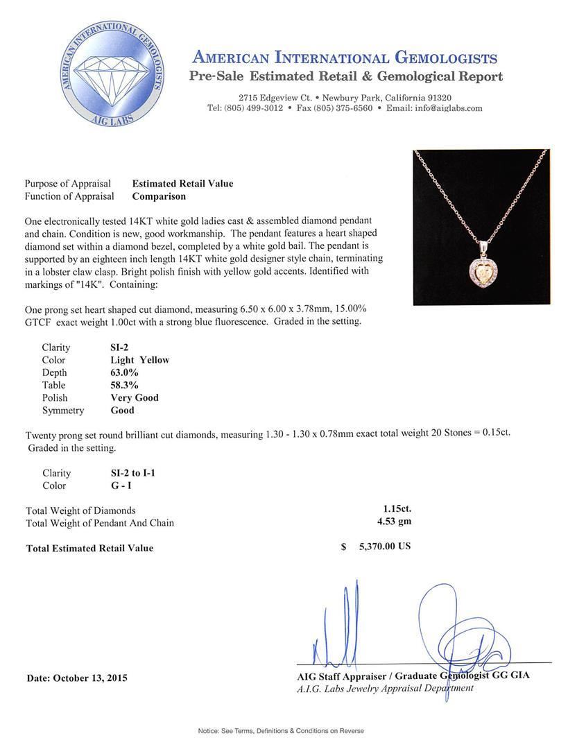 One electronically tested 14KT white gold ladies cast & assembled diamond pendant and chain. The pendant features a heart shaped diamond set within a diamond bezel, completed by a white gold bail. The pendant is supported by an eighteen inch length 14KT white gold designer style chain, terminating in a lobster claw clasp. Bright polish finish with yellow gold accents. Identified with markings of "14K". Condition is new, good workmanship. Containing: One prong set heart shaped cut diamond, measuring 6.50 x 6.00 x 3.78mm, 15.00% GTCF exact weight 1.00ct with a strong blue fluorescence. Graded in the setting. Clarity: SI-2. Depth: 63.0%. Table 58.3%. Twenty prong set round brilliant cut diamonds, measuring 1.30 - 1.30 x 0.78mm exact total weight 20 Stones = 0.15ct. Graded in the setting. Clarity: SI-2 to I-1. Color: G - I. Total Weight of Diamonds 1.15ct. Total Weight of Pendant And Chain 4.53gm. AIG Appraised.