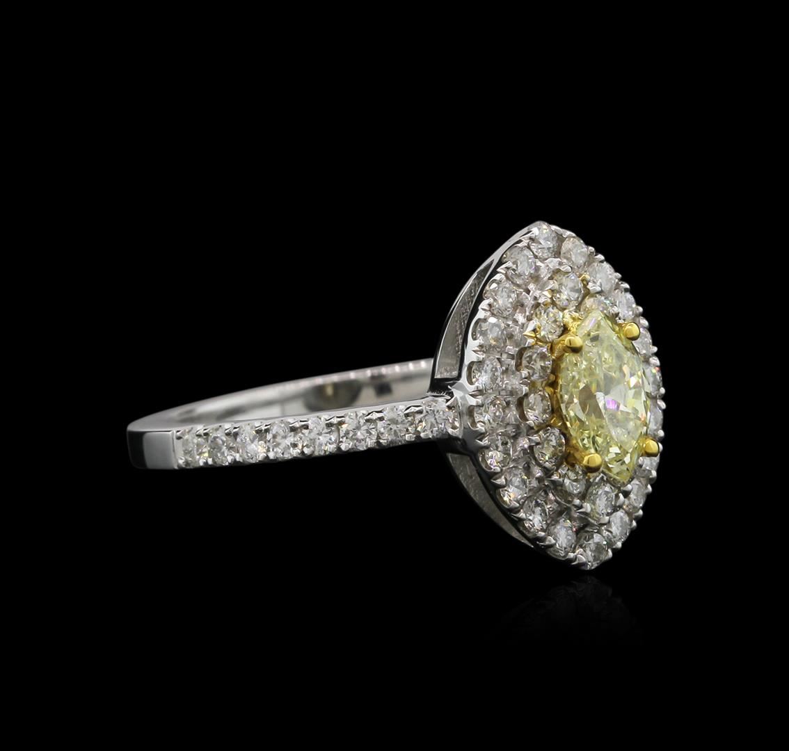 One ring featuring: 14KT white gold weighing 3.93 grams containing one prong set marquise cut fancy yellow diamond center stone with a total weight of 0.50ct and pave set round white diamonds with a total weight of 0.65ct.