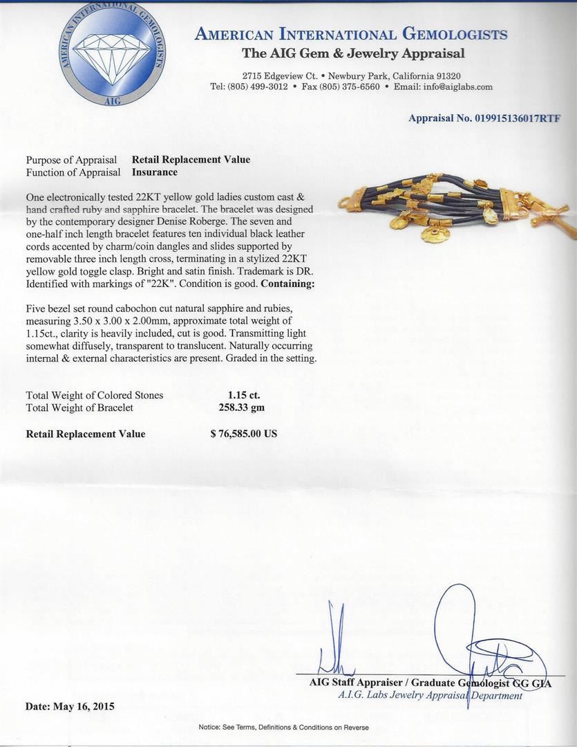 One electronically tested 22KT yellow gold ladies custom cast & hand crafted ruby and sapphire bracelet. The bracelet was designed by the contemporary designer Denise Roberge. The seven and one-half inch length bracelet features ten individual black leather cords accented by charm/coin dangles and slides supported by removable three inch length cross, terminating in a stylized 22KT yellow gold toggle clasp. Bright and satin finish. Trademark is DR. Identified with markings of "22K". Condition is good. Containing: Five bezel set round cabochon cut natural sapphire and rubies, measuring 3.50 x 3.00 x 2.00mm, approximate total weight of 1.15ct., clarity is heavily included, cut is good. Transmitting light somewhat diffusely, transparent to translucent. Naturally occurring internal & external characteristics are present. Graded in the setting. Total Weight of Colored Stones: 1.15 ct. Total Weight of Bracelet: 258.33 gm. AIG Appraised at $76,585.00.