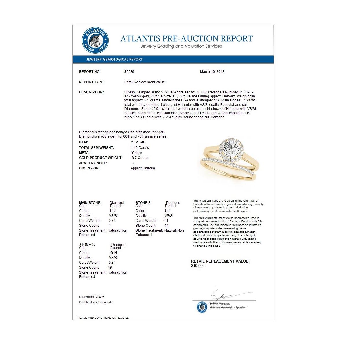 REF-214W2F -30989 ---- 1.16 CTW Certified VS/SI Diamond 2Pc Wedding Set Solitaire Halo 14K Yellow Gold ---- Luxury Designer Brand 2 Pc Set Appraised at $10,600 Certificate Number US30989 14k Yellow gold, 2 Pc Set Size is 7, 2 Pc Set measuring approx. Uniform, weighing in total approx. 8.5 grams. Made in the USA and is stamped 14k, Main stone 0.75 carat total weight containing 1 pieces of H-J color with VS/SI quality Round shape cut Diamond , Stone #2 0.1 carat total weight containing 14 pieces of H-I color with VS/SI quality Round shape cut Diamond , Stone #3 0.31 carat total weight containing 19 pieces of G-H color with VS/SI quality Round shape cut Diamond