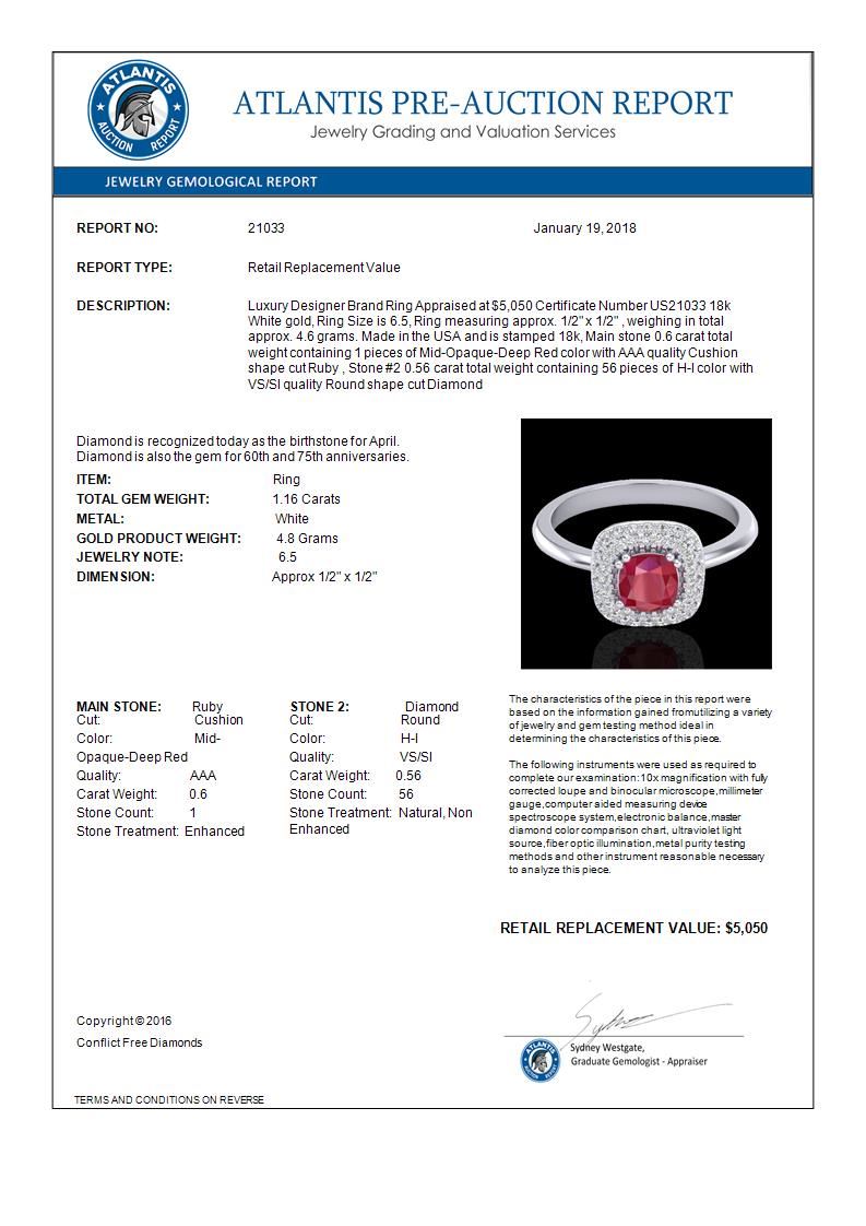 REF-70H9A -21033 ---- 1.16 CTW Ruby & Micro Pave VS/SI Diamond Ring Double Halo 18K White Gold ---- Luxury Designer Brand Ring Appraised at $5,050 Certificate Number US21033 18k White gold, Ring Size is 6.5, Ring measuring approx. 1/2" x 1/2" , weighing in total approx. 4.6 grams. Made in the USA and is stamped 18k, Main stone 0.6 carat total weight containing 1 pieces of Mid-Opaque-Deep Red color with AAA quality Cushion shape cut Ruby , Stone #2 0.56 carat total weight containing 56 pieces of H-I color with VS/SI quality Round shape cut Diamond