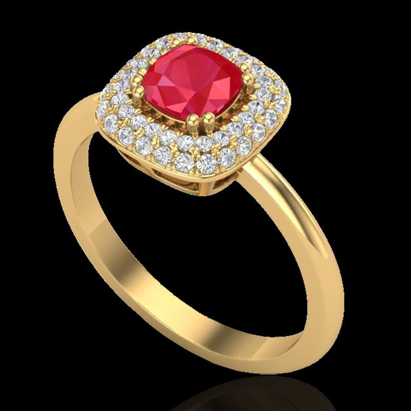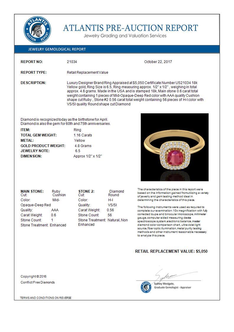 REF-70W9F -21034 ---- 1.16 CTW Ruby & Micro Pave VS/SI Diamond Ring Double Halo 18K Yellow Gold ---- Luxury Designer Brand Ring Appraised at $5,050 Certificate Number US21034 18k Yellow gold, Ring Size is 6.5, Ring measuring approx. 1/2" x 1/2" , weighing in total approx. 4.6 grams. Made in the USA and is stamped 18k, Main stone 0.6 carat total weight containing 1 pieces of Mid-Opaque-Deep Red color with AAA quality Cushion shape cut Ruby , Stone #2 0.56 carat total weight containing 56 pieces of H-I color with VS/SI quality Round shape cut Diamond
