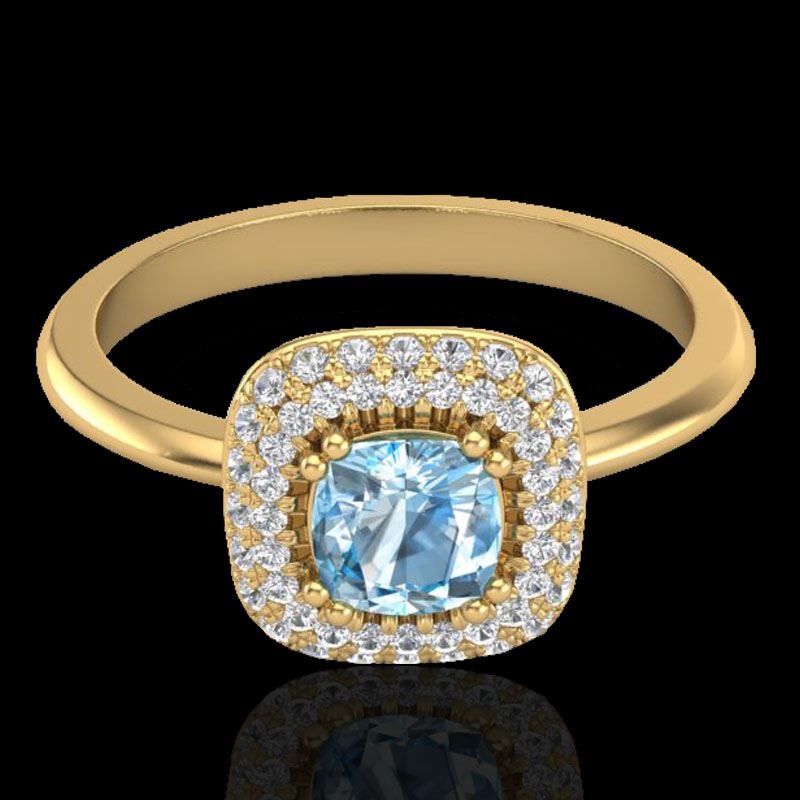 REF-70W2F -21024 ---- 1.16 CTW Sky Blue Topaz & Micro VS/SI Diamond Ring Solitaire Halo 18K Yellow Gold ---- Luxury Designer Brand Ring Appraised at $5,400 Certificate Number US21024 18k Yellow gold, Ring Size is 6.5, Ring measuring approx. 1/2" x 1/2" , weighing in total approx. 4.6 grams. Made in the USA and is stamped 18k, Main stone 0.6 carat total weight containing 1 pieces of Translucent Sky Blue color with AAA quality Cushion shape cut Topaz , Stone #2 0.56 carat total weight containing 56 pieces of H-I color with VS/SI quality Round shape cut Diamond