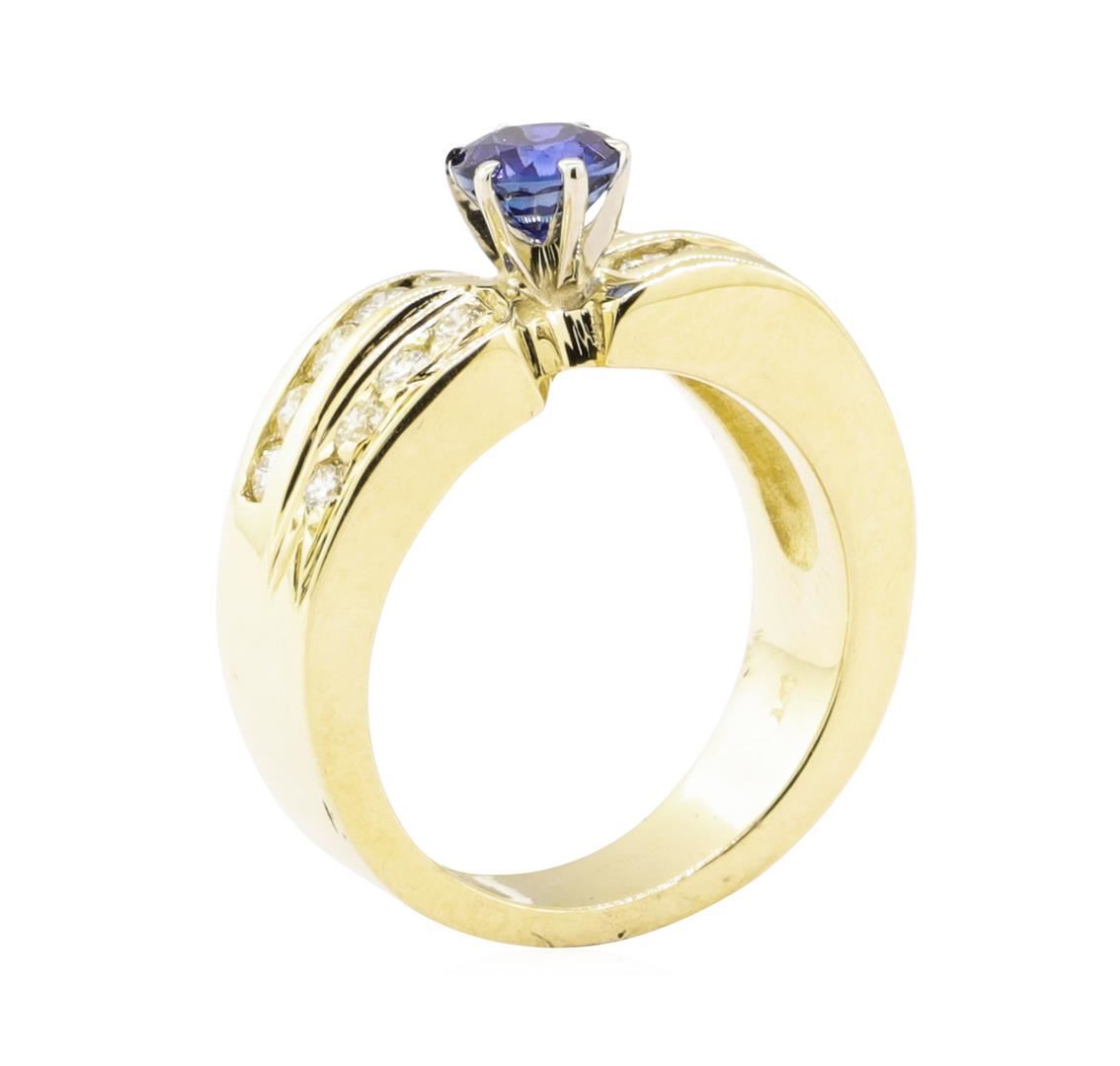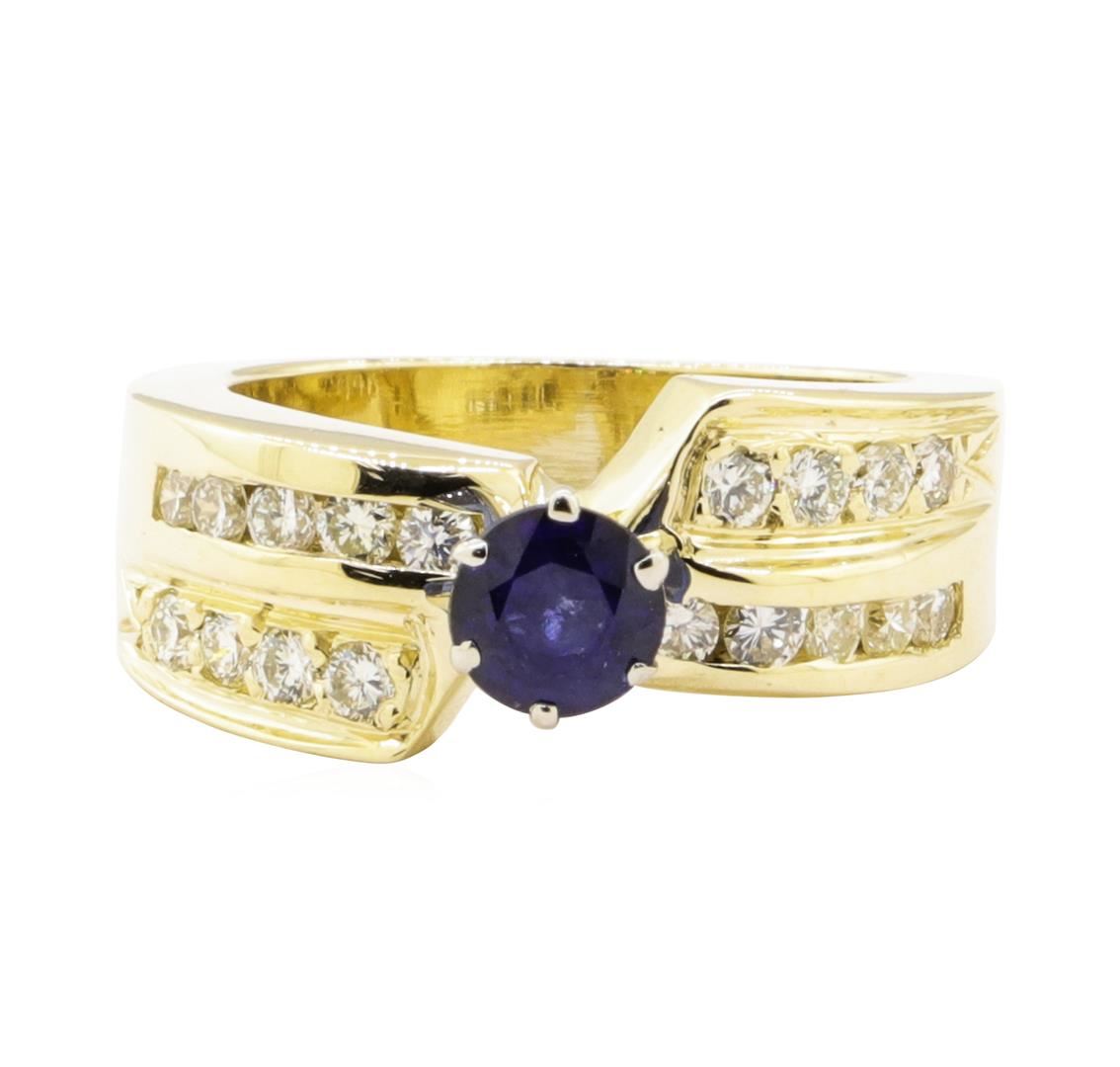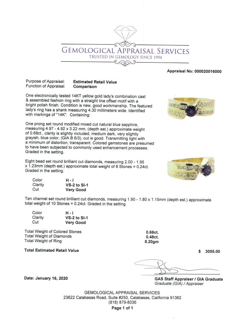 One electronically tested 14KT yellow gold lady's combination cast & assembled fashion ring with a straight line offset motif with a bright polish finish. The featured lady's ring has a shank measuring 4.30 millimeters wide. Identified with markings of '14K'. Condition is new, good workmanship. Containing: One prong set round modified mixed cut natural blue sapphire, measuring 4.97 - 4.92 x 3.22 mm, (depth est.) approximate weight of 0.68ct., clarity is slightly included, medium dark, very slightly grayish, blue color, (GIA B 6/3), cut is good. Transmitting light with a minimum of distortion, transparent. Colored gemstones are presumed to have been subjected to commonly used enhancement processes. Graded in the setting. Eight bead set round brilliant cut diamonds, measuring 2.00 - 1.95 x 1.23mm (depth est.) approximate total weight of 8 Stones = 0.24ct. Graded in the setting. Color H - I Clarity VS-2 to SI-1 Cut Very Good Ten channel set round brilliant cut diamonds, measuring 1.90 - 1.80 x 1.15mm (depth est.) approximate total weight of 10 Stones = 0.24ct. Graded in the setting. Color H - I Clarity VS-2 to SI-1 Cut Very Good. Total Weight of Colored Stones 0.68ct.. Total Weight of Diamonds 0.48ct.. Total Weight of Ring 8.20gm GAS Appraised at $3055.00. GAS Appraised.