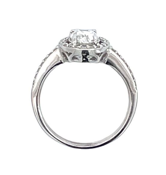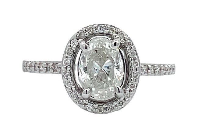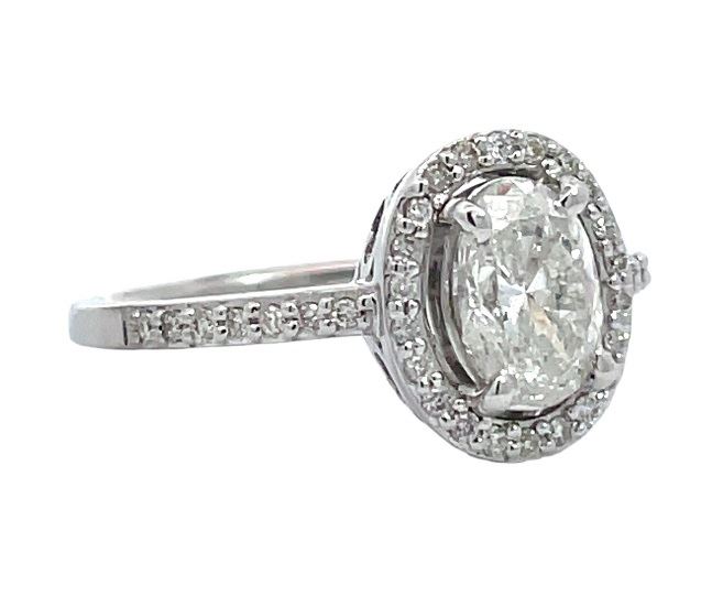 One electronically tested 14KT white gold lady's cast oval halo wedding ring with a cathedral basket motif with a bright polish finish. The featured lady's ring has a shank measuring 1.50 millimeters wide. Identified with markings of "14K". Condition is new, good workmanship.Containing: One prong set oval shaped cut diamond, measuring 7.70 x 5.48 x 3.48mm (depth est.), 5.00% GTCF approximate weight of 1.00ct. Graded in the setting.Color H - IClarity SI-3 Cut Very Good Thirty-Six prong set round brilliant cut diamonds, measuring 1.10 - 1.05 x 0.65mm (depth est.) approximate total weight of 36 Stones = 0.16ct. Graded in the setting.Color H - IClarity VS-2 to SI-2Cut Good Total Weight of Diamonds 1.16ct. Total Weight of Wedding Ring 3.00gm