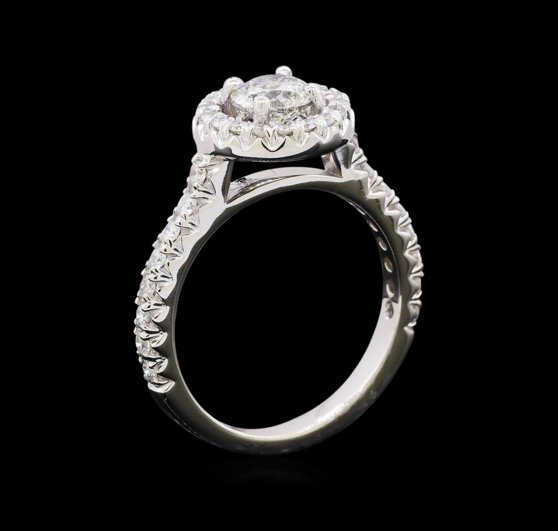 One electronically tested 14KT white gold lady's cast straight line wedding ring with a halo with a bright polish finish. The featured lady's ring has a shank measuring 2.30 millimeters in width. Identified with markings of "14K". Condition is new, good workmanship. Containing: One prong set round brilliant cut diamond, measuring 5.53 - 5.47 x 3.90mm (depth est.) approximate weight of 0.71ct. Graded in the setting. Clarity: I-1. Color: H - I. Cut Good Thirty-Four prong set round brilliant cut diamonds, measuring 1.60 - 1.50 x 0.93mm (depth est.) approximate total weight of 34 Stones = 0.45ct. Graded in the setting. Clarity: SI-1 to SI-2. Color: G - Good. Total Weight of Diamonds 1.16ct. Total Weight of Wedding Ring 4.70gm. GAS Appraised at $5,905.00.