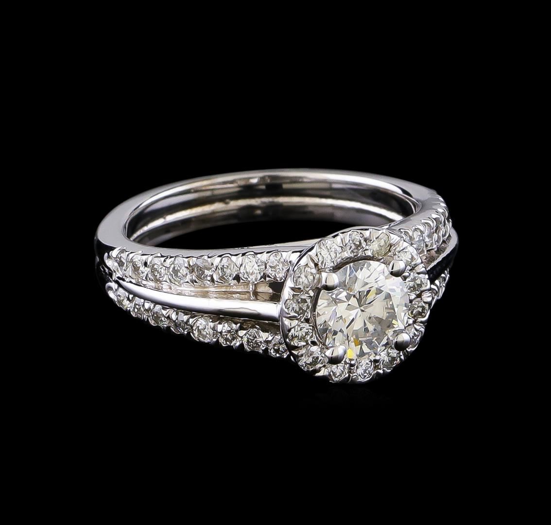 One electronically tested 14KT white gold lady's cast wedding ring with a split shank cathedral halo with a bright polish finish. The featured lady's ring has a double shank measuring 3.0 millimeters in width. Identified with markings of "14K". Condition is new, good workmanship. Containing: One prong set round brilliant cut diamond, measuring 5.48 - 5.48 x 3.28mm (depth est.) approximate weight of 0.62ct. Graded in the setting. Clarity: SI-2. Color: H - I. Cut Good Forty-Six prong set round brilliant cut diamonds, measuring 1.50 - 1.40 x 0.90mm (depth est.) approximate total weight of 46 Stones = 0.54ct. Graded in the setting. Clarity: SI-1 to SI-2. Color: G - Good. Total Weight of Diamonds 1.16ct. Total Weight of Ring 4.90gm. GAS Appraised at $6,575.00.